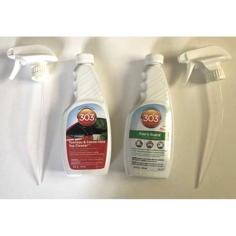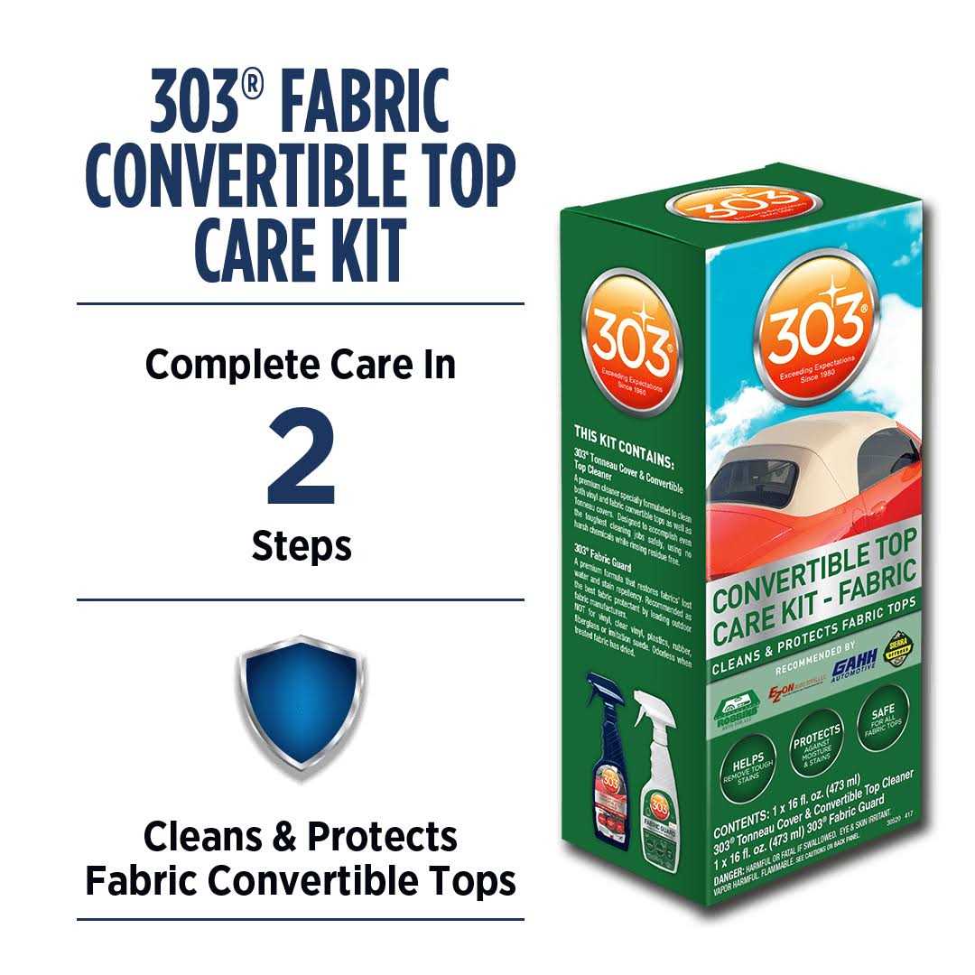Convertible Top Cleaners by 303 Products. Details:With this kit, proper care of your fabric convertible top is easy! It will save you money and add years to the life of your convertible top. This kit contains both 303 Tonneau & Convertible Top Cleaner, to help remove stains, dirt and debris, and 303 Fabric Guard to help restore water and stain properties to the fabrics, to keep your convertible top looking newer, longer. 303 Tonneau Cover and Convertible Top Cleaner is formulated to clean and brighten Tonneau covers, fabric and vinyl convertible tops and car bras. Recommend to use prior to treating with 303 Fabric Guard or Protectant. 303 Fabric Guard will restore lost water and stain properties.