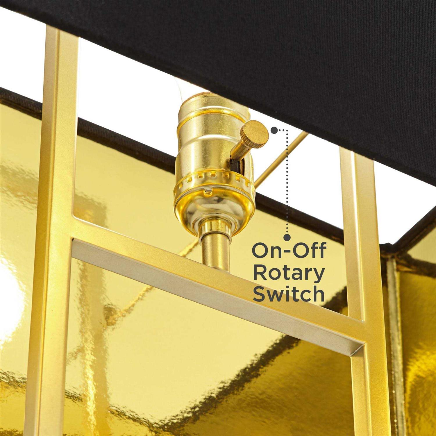 Black and gold is a classic combination that always looks stylish and elevates a space. These contemporary modern table lamps feature a sleek and linear gold frame with a gray faux marble bases. This luxe design is complete with a black rectangular shades.