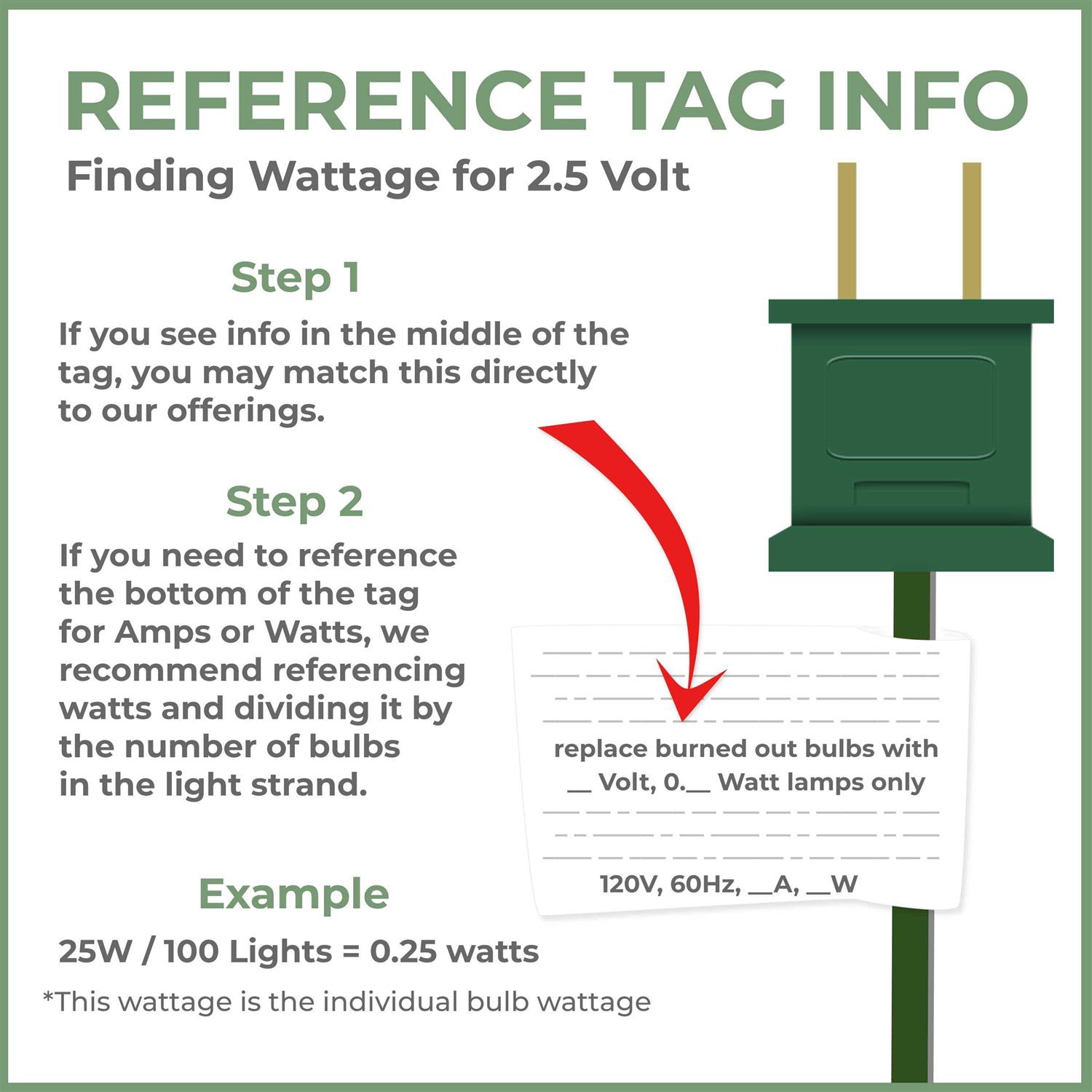 These 100 mA, 2.5 volts mini Christmas replacement bulbs are intended for incandescent string lights that require 0.25-watt lamps. It is important to double-check the wattage (or amperes) required for your light set before purchasing. The unique pinched-base shape guarantees a secure fit in most every string light (regardless of whether the pinched base is required or not). The value pack is sold in a box with a bag of 100 bulbs for easy storage. Please be sure to reference the tag near the male plug on your light set to confirm both the voltage and wattage for your string. Voltage, amperes, and wattage must all match the following bulb specifications: 2.5 volts, 100 mA, 0.25 watt.