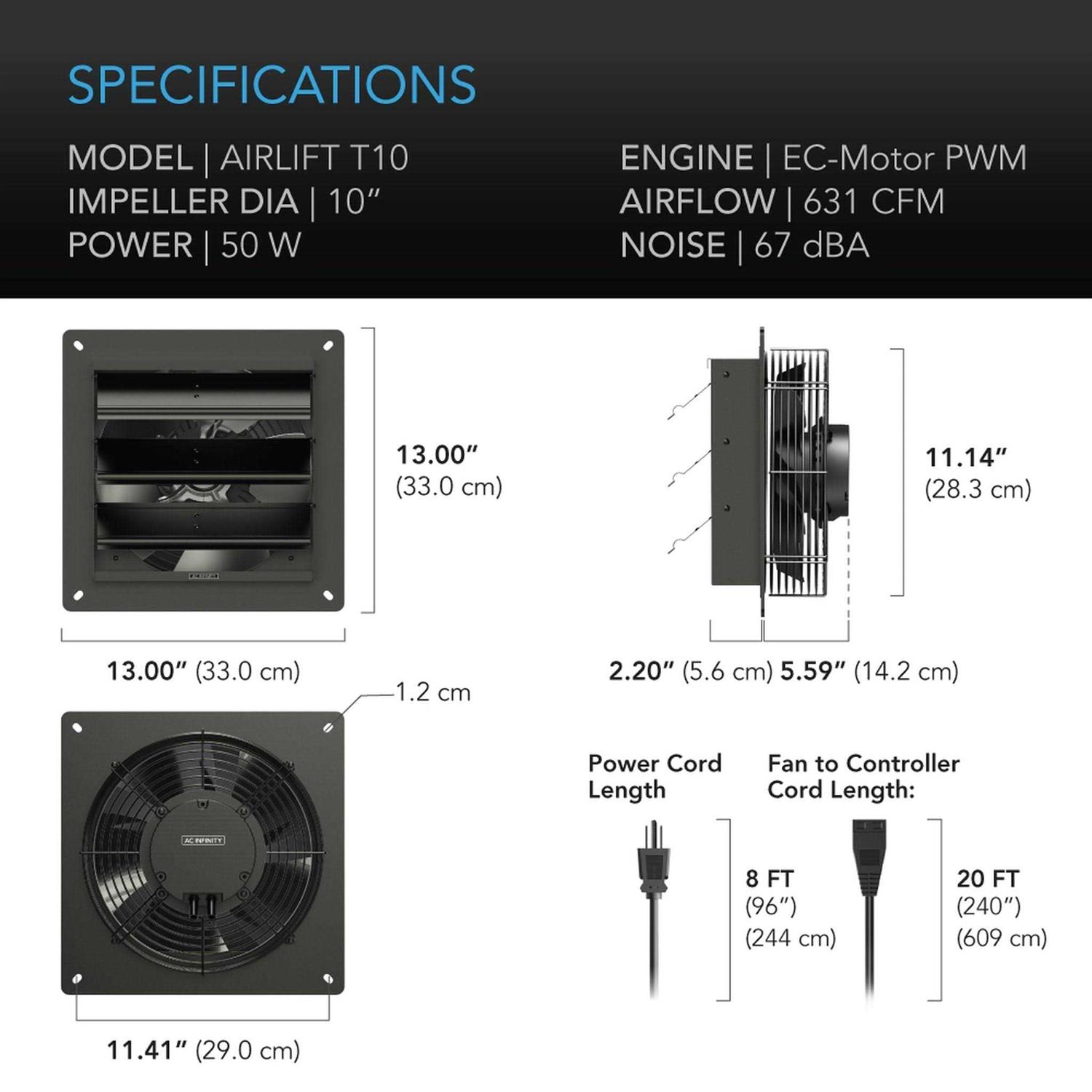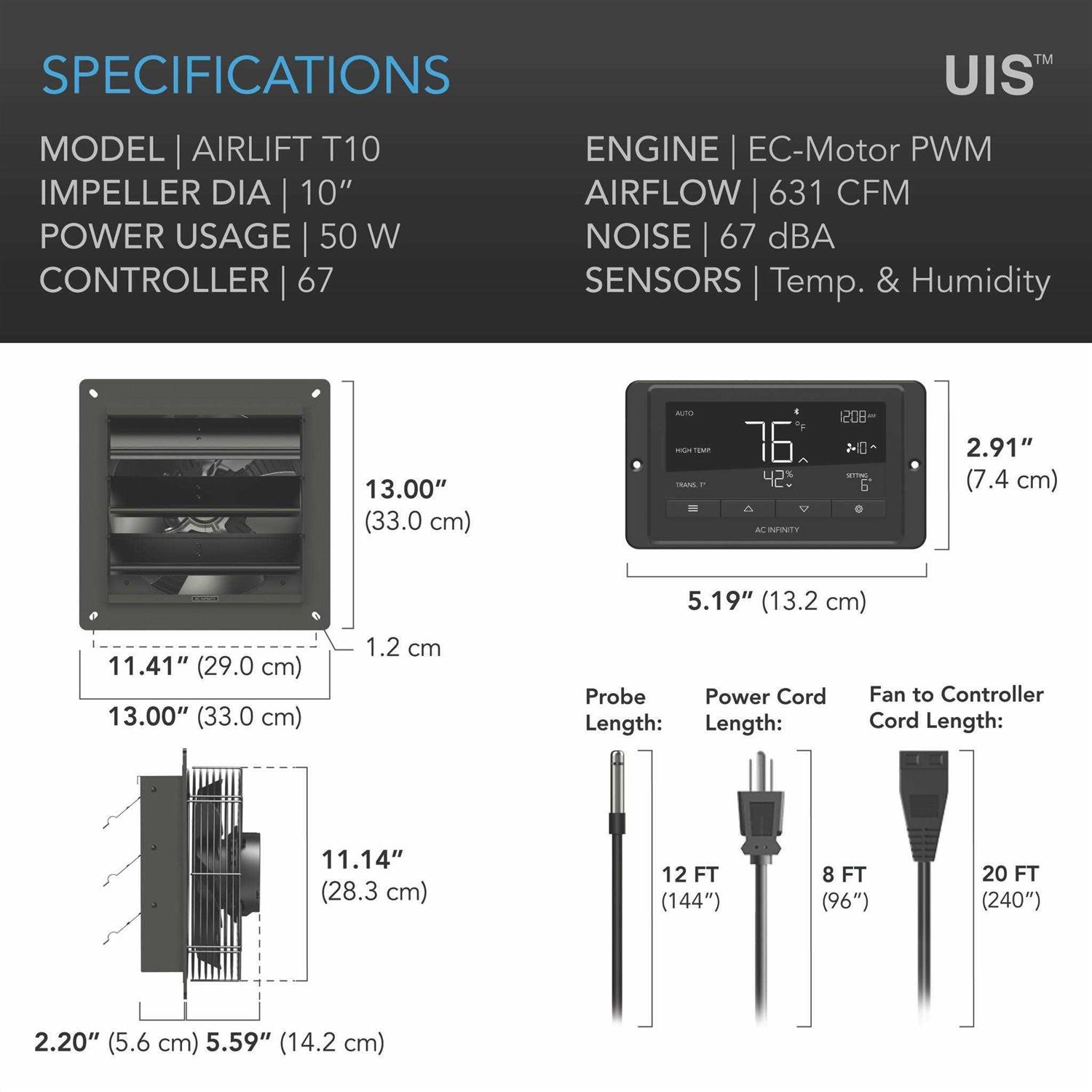 Product Description A high-airflow exhaust fan designed to cool and ventilate greenhouses, garages, attics, workshops, and sheds. The system can automatically eliminate heat, moisture, odor, and dust from enclosures, rooms and buildings. Features a LCD display with remote smart temperature and humidity sensors, as well as customizable fan speeds. Innovative EC-motor with PWM-control maximizes airflow while reducing energy consumption and noise levels. Heavy-duty build features aluminum blades, steel wire guards, and galvanized-steel shutters. Includes everything needed to mount the fan unit and power it through an outlet. Smart Programming The controller included with each unit features active temperature and humidity monitoring. Fan speeds can be programmed to automatically adjust to high and low temperatures and humidity. The program can be manually set to run continuously or on a timer at custom speeds. Also features alarm warnings, fan failure alerts, eco-mode, and backup memory. Included 12-foot corded sensor probe plugs into the controller to provide temperature and humidity readings. The controller can control up to two AIRLIFT series fans. Heavy-Duty Performance Features galvanized-steel shutters that are weather and corrosion resistant, and automatically closes when not in use. The blades and impeller are constructed of lightweight aluminum, weight-balanced to reduce vibrations. Utilizing an innovative EC motor that is controlled electronically using PWM (Pulse Width Modulation), the fans can maximize airflow while reducing noise and power consumption. The fully-enclosed motor is also permanently lucubrated and houses dual-ball bearings rated at 67,000 hours. The unit is IP-44 rated to be highly resistant to dust and liquids, and performs well even in harsh environments.PROP 65 WARNING: This product can expose you to some kind of chemical, which is known to the State of California to cause cancer.
