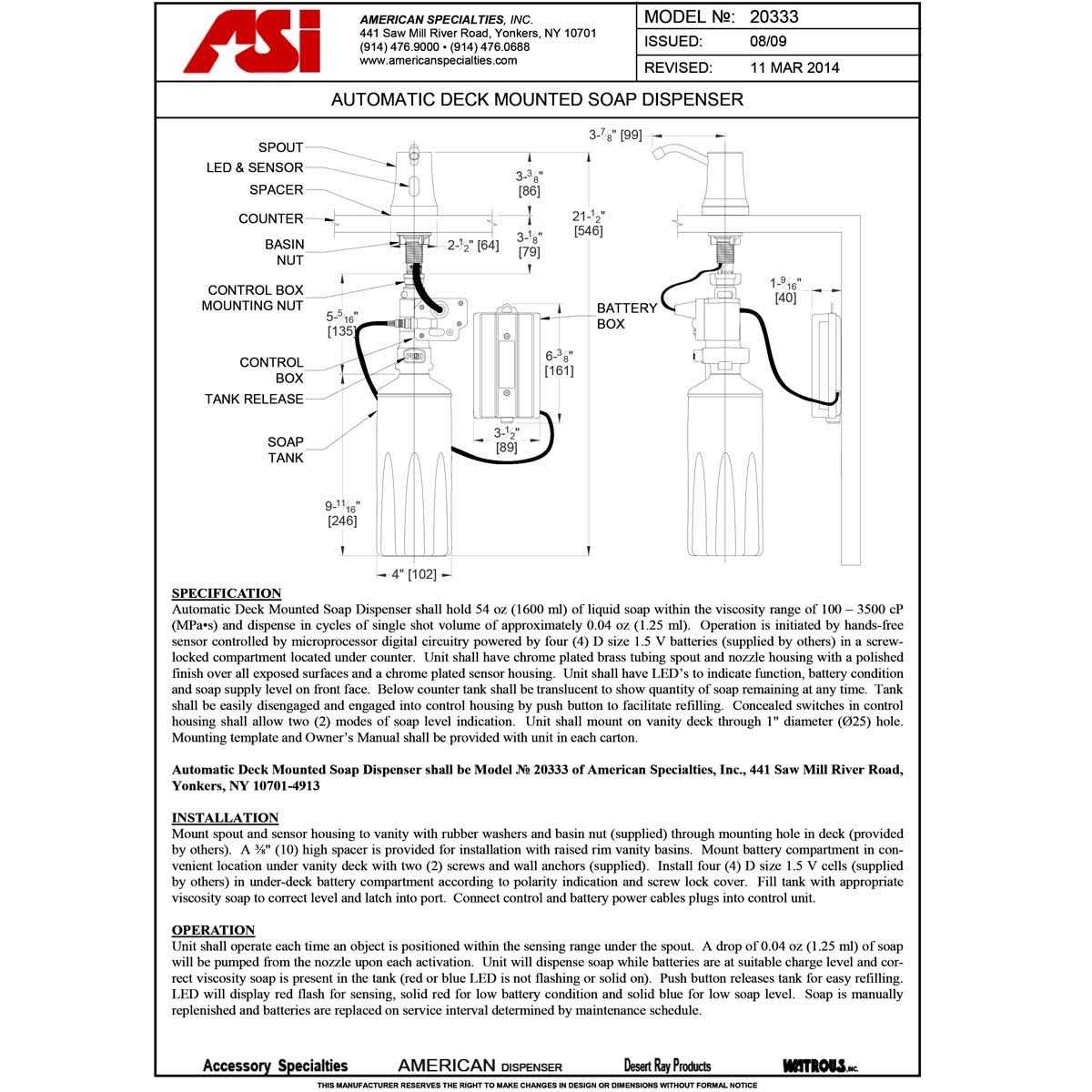 The ASI 20333 Roval Automatic Deck Mounted Soap Dispenser is designed to be used in the counter top area adjacent to the sink in your commercial washroom facility. For proper installation, the dispenser requires an opening that is 1 inch in diameter. The dispenser releases .04 ounces of soap automatically from its 3-7/8-inch spout each time a user activates the built-in motion sensor. The unit holds 54 ounces of soap, detergent or lotion and can accommodate solutions that are 100 to 3500 MilliPascals per second in viscosity. To power the unit, the soap dispenser requires four D size 1.5-volt batteries. Blue and red LED lights in the unit notify you if there is a problem with the battery charge or the viscosity of the soap. The overall height of the unit is 21-1/2 inches, but once installed, only the top 3-3/8 inches of the dispenser are visible above the counter top.