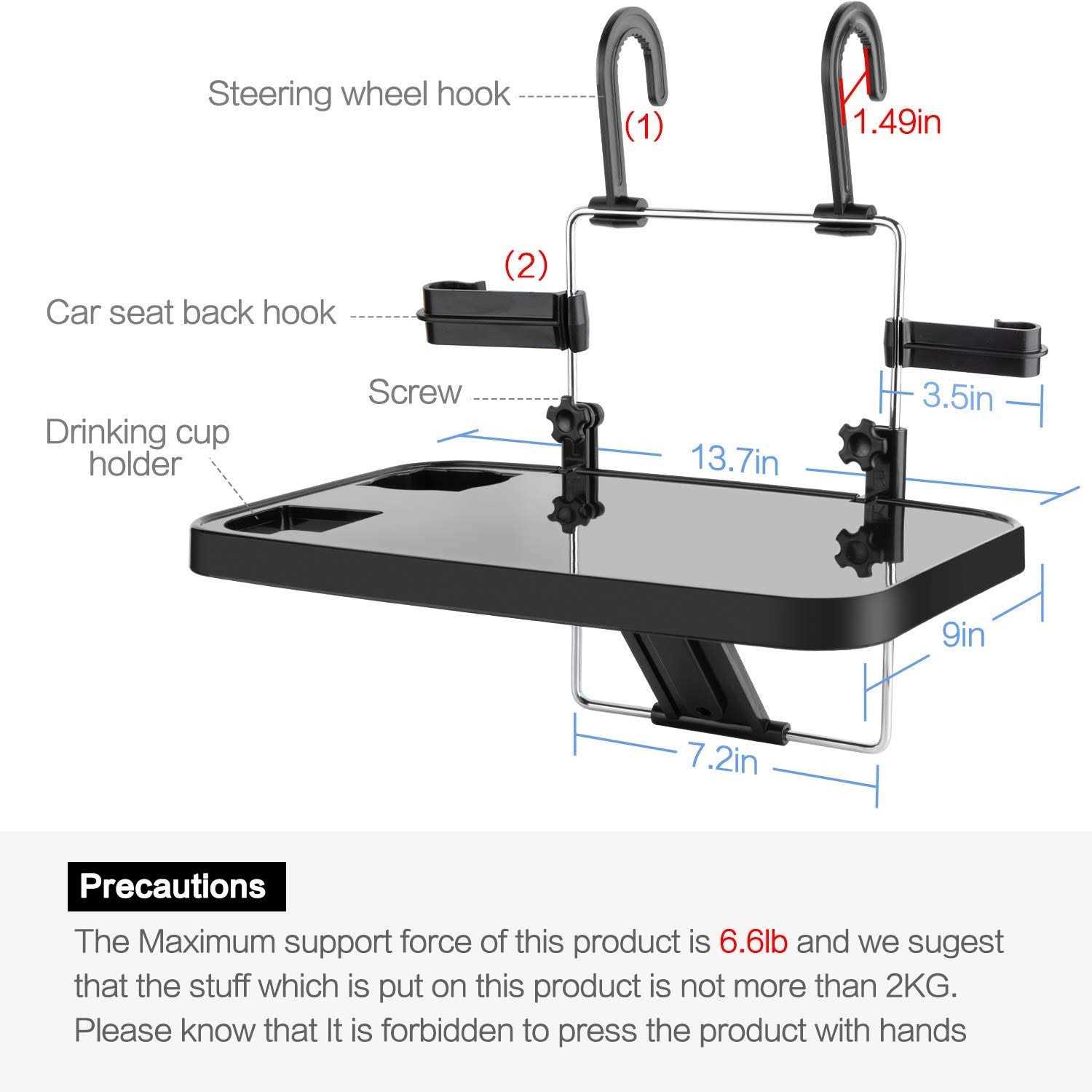 【Tips and How to use it?】:The maximum load is 6.6lb. It is forbidden to use it as a handrail and not recommended to write on this product. But you can use it as:1car seat back portable tray;2steering wheel tray. 【How to adjust the table】:1The rotation button on the anti-skid rod can adjust the height of the tray; 2The rotation button at the bottom of the tray can be used to adjust the balance of the tray; 3The height adjustment telescopic plate on the back of the tray has 2 positions. The board is adjusted to the 2nd position. 【Easy Install and Storage】: 1If you use it for car seat back portable tray, you need to install car seat back hook. 2If you use it for car steering wheel tray, you need to install the steering wheel hook. There are 3 storage methods:1 You can put the car steering wheel tray in the trunk of the car; 2 Install the car seat back hook, then hang it behind the seat and fold it to complete the storage;3 Put it in the car seat back pocket. 【Great Gift to Friends】:It is suitable as a light reading, office, and dining table. It provides convenience for people traveling in business, tourism and leisure.