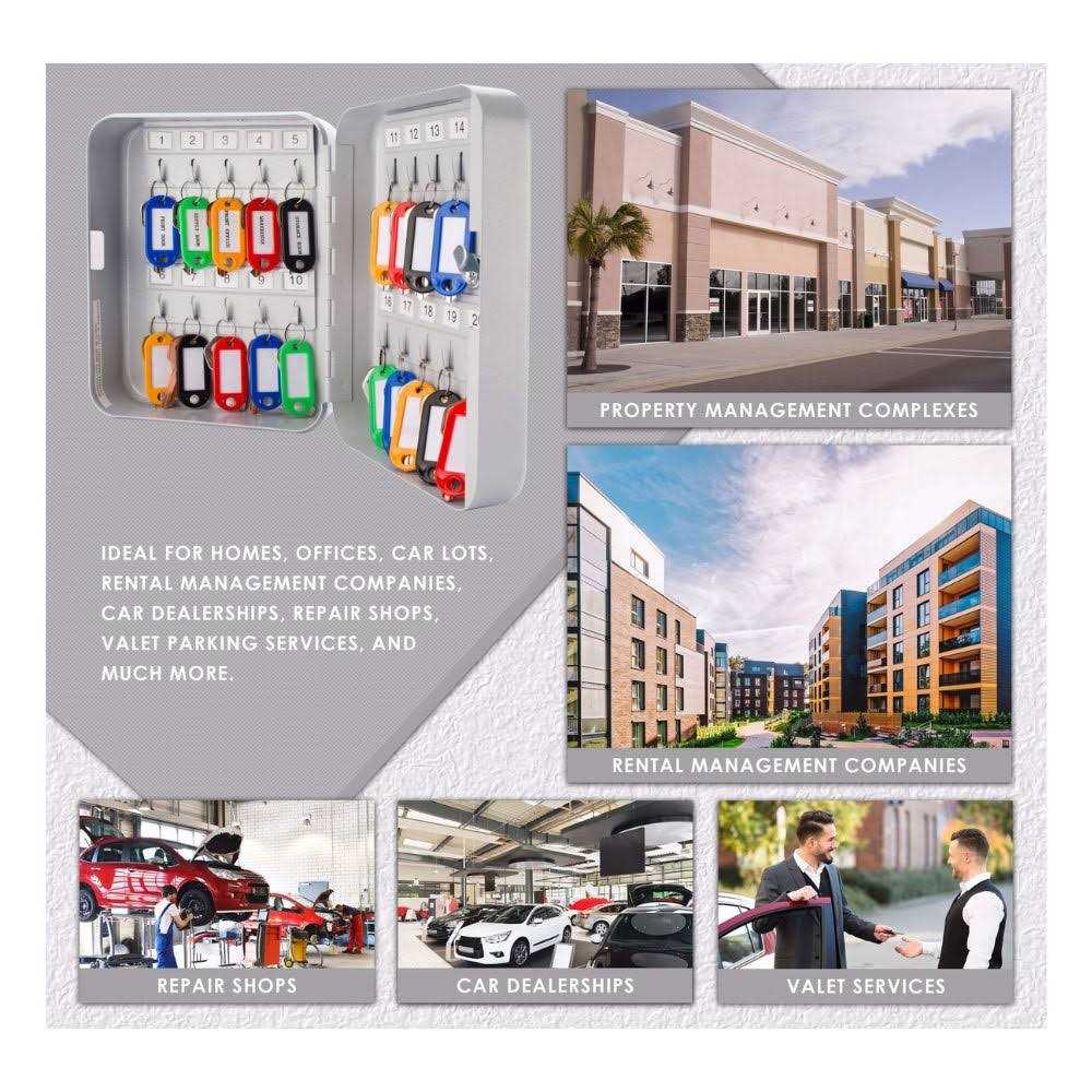Outer Dimensions L x W x H 6.25 X3 X8 Holds 20 keys securely Key locking System The 20 position key lock box from makes key organization easy and convenient with a hook-style cabinet. Inside this key cabinet are two rows of numbered hooks. The safe has four pre-drilled mounting holes and included hardware for installation. The safe walls and door are constructed of 0.8mm solid steel and finished with a flat gray coating. Ideal for home, office, apartment complexes, rental management companies, car lots, body shops, and many more. Includes keys, mounting hardware, and colored key Tags.