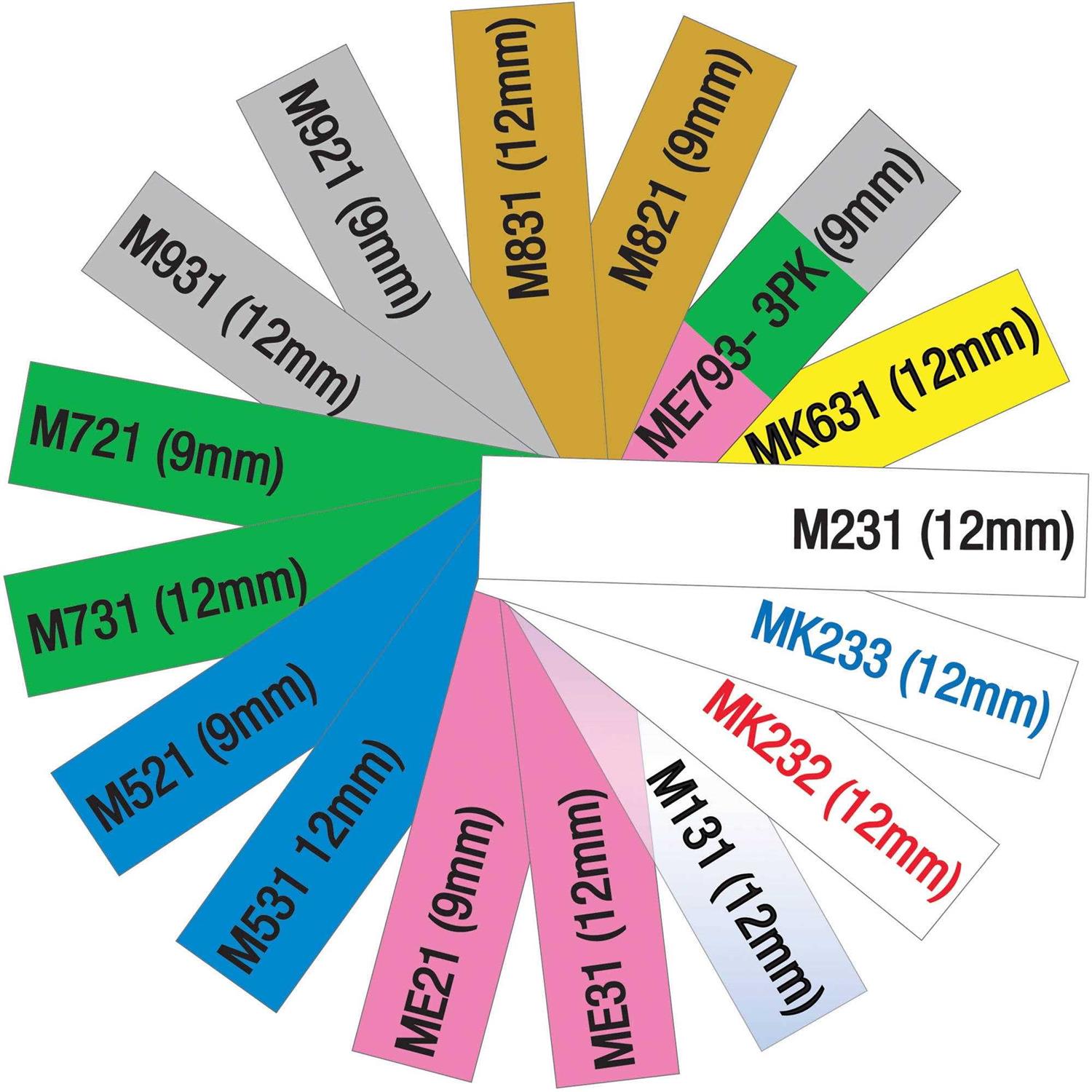 - Uses non-laminated “M” series tapes – available in 9mm and 12mm widths