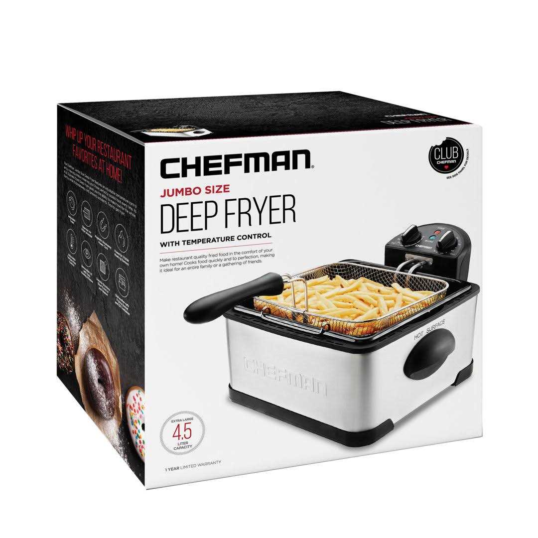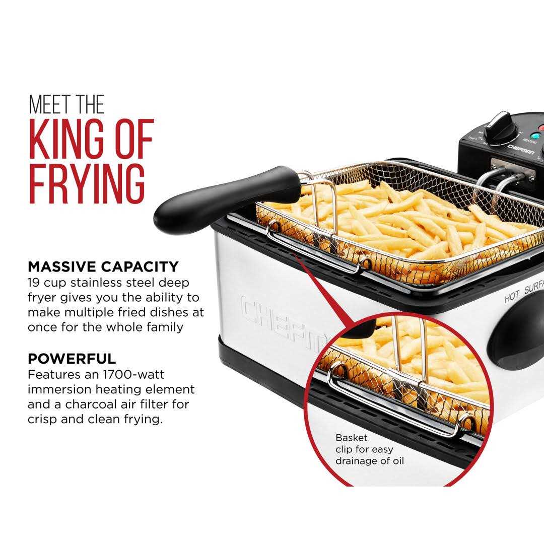 Start frying up something delicious in the Chefman Jumbo Size Deep Fryer. The extra-large capacity makes it simple to fry multiple foods all at once. The stainless steel deep fryer has a large capacity of 4 liters that cooks food to perfection.Easily keep an eye on the food you are cooking through the viewing window. This frying unit also includes adjustable time and temperature controls. The unit has a temperature range from 0-375?. The deep fryer has a strong 1700 watt heating element and a charcoal air filter fries food fast. The unique magnetic breakaway cord helps prevent accidents and spills on the kitchen counter. Clean up hassle-free with the included removable oil tray and stainless steel basket that are dishwasher safe. Get frying the perfect donuts, fries, onion rings, chicken, and more. Tackle these amazing family size dishes in the Chefman Jombo Size Deep Fryer in Stainless Steel.