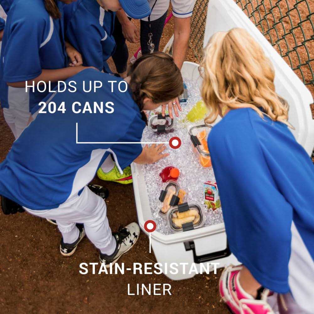 Holds Up To 204 Beverage Cans 2 Handles Ice Retention Up To 6 Days Built-in Cup Holders Have-a-seat Lid Supports Up To 250 Lbs. Water Drain Antimicrobial And Stain Resistant Liner Built-in Ruler Rust-resistant Stainless Steel Hardware Uv Protected Polyethylene Thermozone Insulation Approx. 33-1/2″W x 18″D x 18-3/4″H