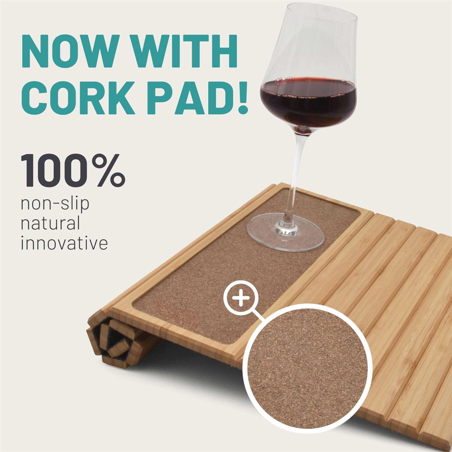 NEW 2023 MODEL : Now featuring an Anti-Slip Pad made from natural cork and compact dimensions. NON-SLIP BASE: Couch tray made from sustainable full-grain bamboo wood with extra non-slip studs on the bottom and an integrated cork pad to prevent slipping. STABLE & ECO-FRIENDLY: Extra strong slats (0.4 inches), made from rapidly renewable bamboo. The water-resistant coating ensures durability, while the translucent grain provides a natural look on the back of the sofa. VERSATILE USAGE: Perfect as an armrest tray for glasses and snacks, or as a drink holder on straight sofa arms ranging from 4 – 18.5 inches in width. The sofa tray can also be used as a side table on the seating area. Function: the Flextray turns your armrest into a practical sofa storage for a drink, snacks or your mobile phone. Individual wooden slats, connected by a non-slip flow on the bottom, make the sofa tray a flexible mat, no matter how wide the backrest of your couch. br/ br/ Environmentally friendly: sustainably grown bamboo wood gives the “Flextray Sofa Butler” the necessary durability. The thin finish allows the grain to shine through, creating a natural look. br/ br/ Use: Make sure to use the sofa tray on flat surfaces, otherwise the items may slip. It is suitable for a straight sofa rest or a free seat on the couch.