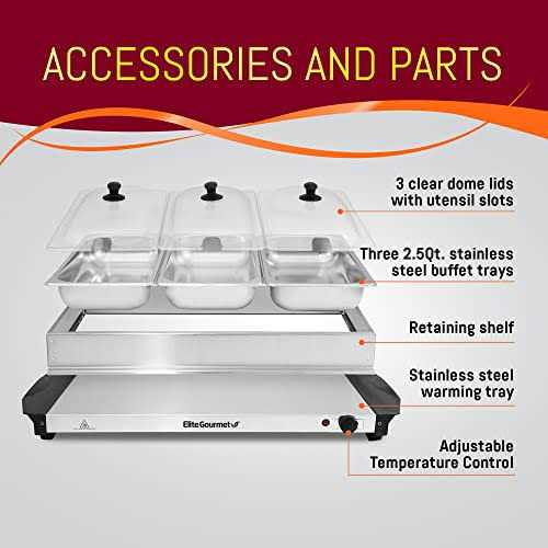 Keep the party going all day and all night with the Stainless Steel Buffet Server and Warming Tray by Elite Platinum. The specially designed buffet server is equipped with a total of three brushed stainless steel 2.5 quart buffet trays. You can also choose to not use the included pans and use your own dinnerware or foil pans by setting them directly on the flat 8-inch by 18-inch warming tray. You can keep food warm for hours at all your social gatherings without using an open flame or warming water. Serve cheesy garlic mashed potatoes, hot gravy and tender turkey breasts all at the same time. Each 2.5 Quart pan has its own BPA-Free clear dome lids with built-in slot for serving utensils. Featuring Low, Medium and High temperature settings, you can easily adjust to keep food piping hot and ready for serving, or set to low while guests mingle. The sleek stainless-steel design making it easy to clean and dishwasher safe. 3 x 2.5Qt. stainless steel buffet trays.