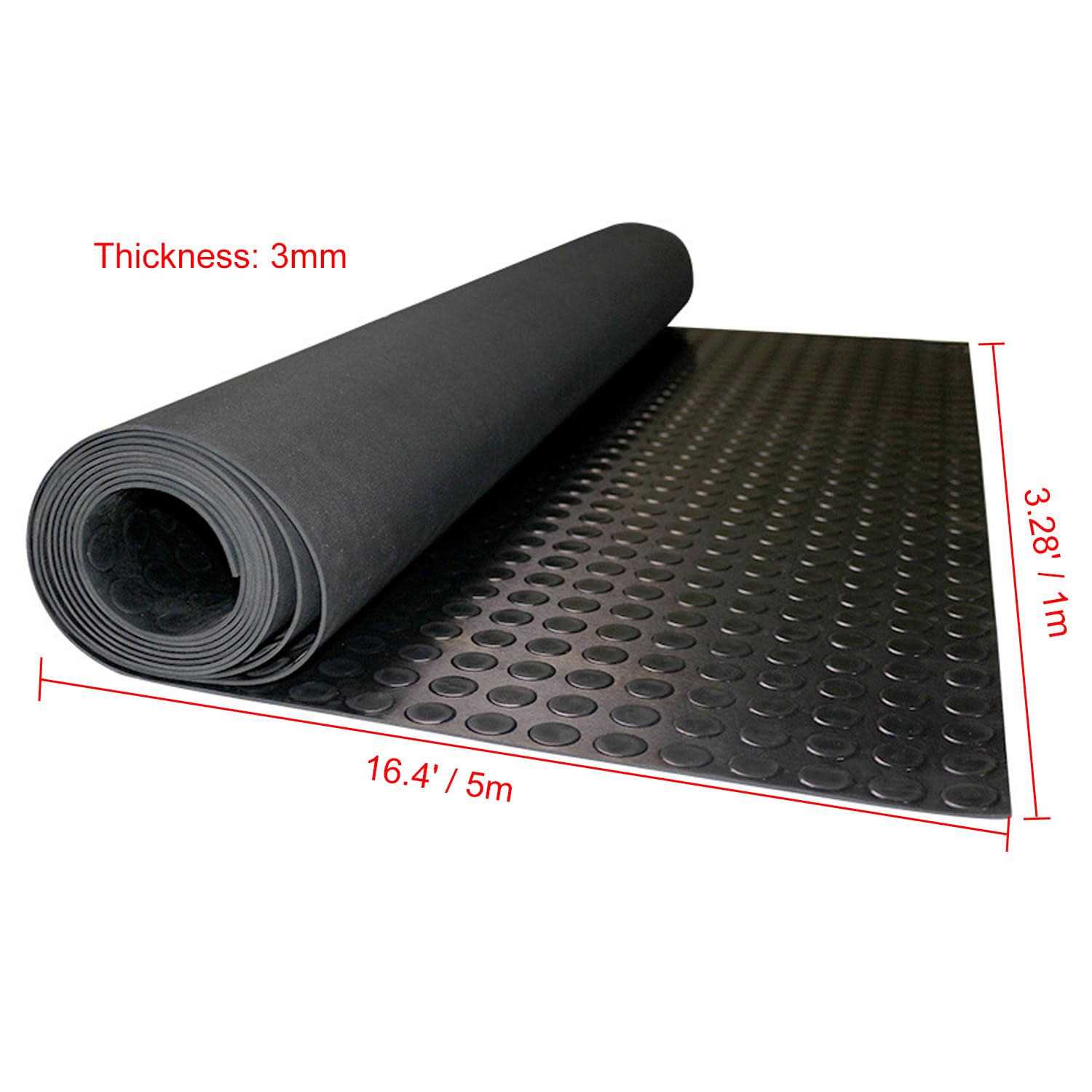 【Premium Rubber Mat】The garage mat roll is 3.28 feet width, 16.4 feet length, 3mm thickness, total covers 161.45 square feet. The rubber mat is wear-resistant, moisture-proof, anti-skid, waterproof, anti-static and anti-aging, good elasticity and anti-pressure, comfortable feet and long service life. 【Slip Resistant】The garage mat roll surface featuers unique raised coin pattern, which will provide traction to help prevent slip, and will stay put even when your shoes are wet. 【Protect Floors】The heavy duty garage floor mat will protect your garage floor from difficult to remove grease or rust stains, oil spills from your truck or motorcycle, tire skids, chemical drips, and other substances that can damage your floors. 【Easy to Clean and Install】Can use vacuum cleaner, brooms and wet & dry mop on cleaning, water-proof rubber mat, no need to detach it for cleaning, just wipe the stains on surface. Just need roll out to use, you can also stick the mat to the floor with tapes to prevent moving. Also cuttable with scissor to suit different room space. 【Versatile Use】Tough and resilient flooring mat is great for office, mall, playground, boat, garage workbench, fitness flooring, kitchen traction mats, boat flooring, garage floor mats, basement floors, and trailer mats, etc. Description: /b br Material: Rubber br Size: 3.28 feet x 16.4 feet / 1m x 5m; thickness: 3mm p – Package list: /b br 1 Roll Rubber Mat