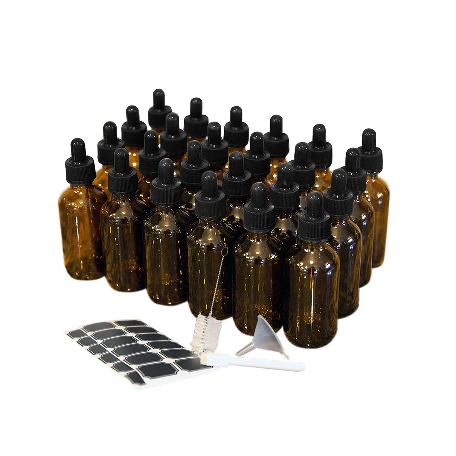 Nevlers 2 oz. Amber Glass Bottles with Dropper, Bottle Brush, Funnel, and Labels (Set of 24)
