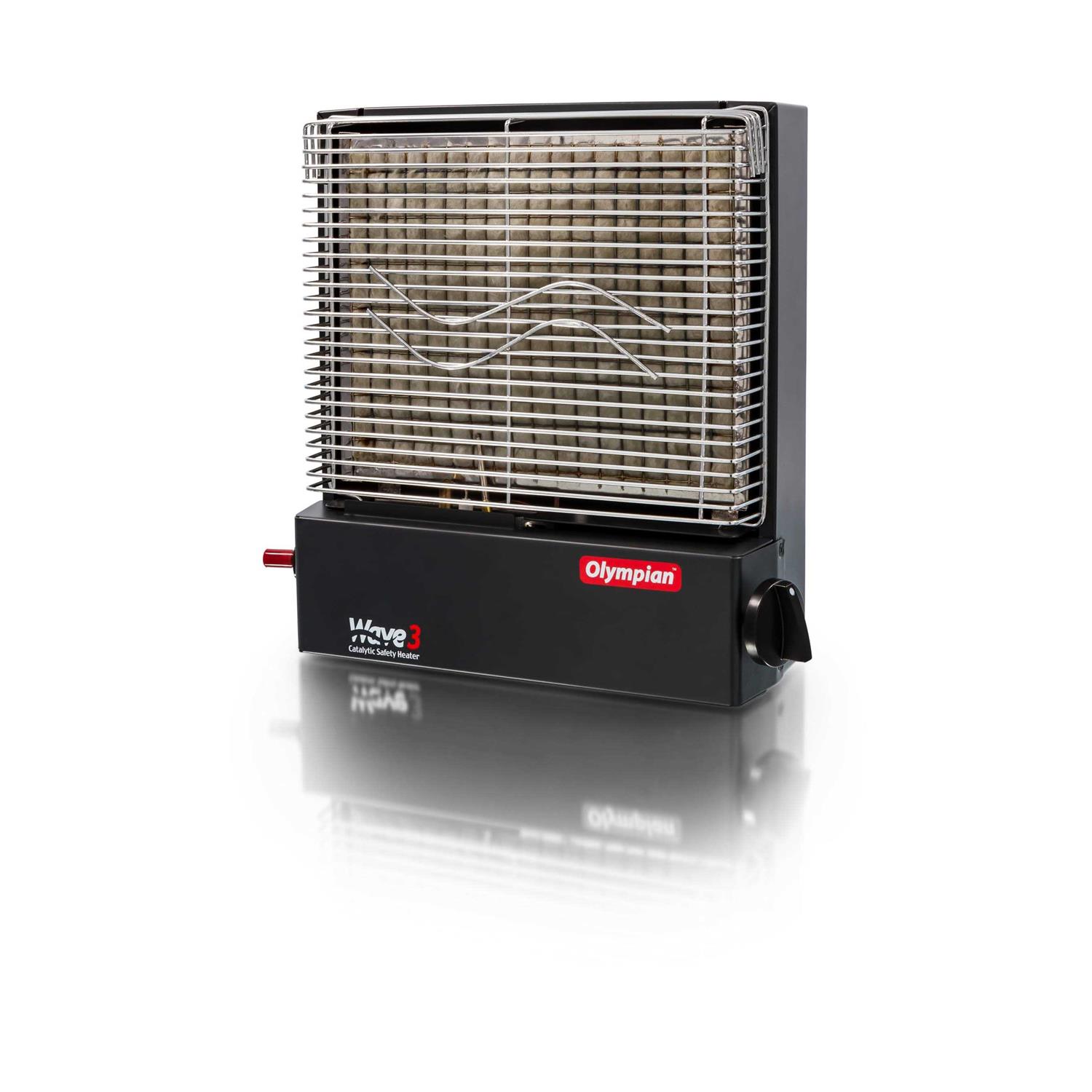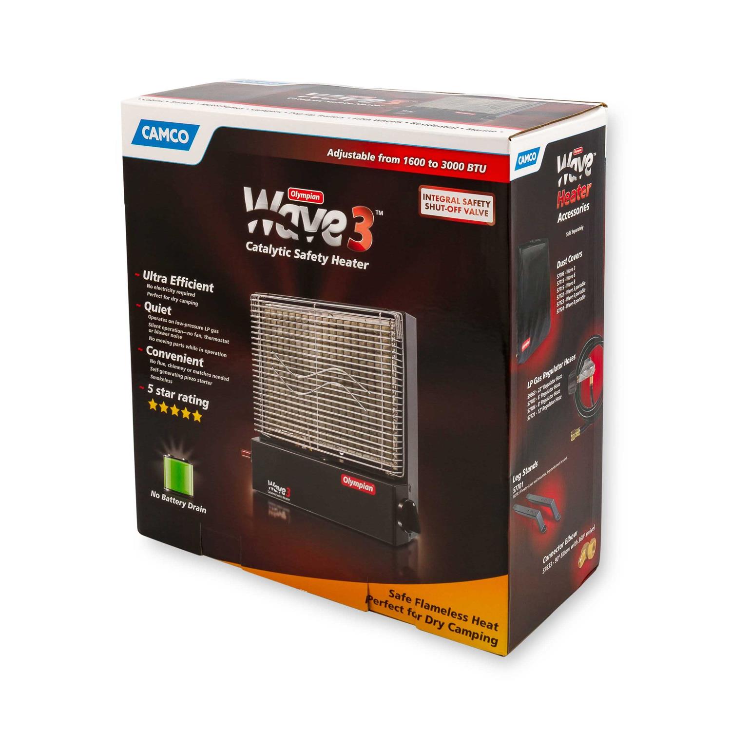 The Camco Olympian Wave 3 Catalytic Safety Heater is an ideal primary or secondary heating source to bring on the go. Use it inside your RV as a portable unit or as a portable heater outdoors! This heater can be permanently mounted on a wall or other surface in vented areas. The Camco Olympian Wave 3 heater operates on low-pressure LP gas with adjustable 1600-3000 BTUs, designed to heat an area of up to 100 square feet. The built-in, self-generating piezo starter can last for around 20,000 starts for consistent long-term use. The integral safety shut-off valve helps stop non-ignition fuel discharge. The Camco Olympian Wave 3 Catalytic Safety Heater employs convenient and easy operation, free of flames, flues, or chimneys. Devoid of fan or blower noises, this smooth operator works in silence. The Olympian catalytic heating element features a high porosity spongy texture, which allows for perfect transport of the oxygen needed for combustion. The catalytic heating element is evenly impregnated with platinum, guaranteeing optimal oxidation of gas and elimination of the mix of dangerous gas emissions. Catalytic heating is over 96% efficient, resulting in efficient, low-cost heat, as opposed to flame-type heaters, which waste up to 45% of all heat produced. The heated area depends greatly on the insulation R-factor and outside temperature. All “heated area” specifications were based on an outside temperature of 35°F and R17 interior insulation. If camping in cooler temperatures, or if the RV is not well insulated, a larger heater should be installed. State and local codes vary and may regulate the installation of this heater in recreational vehicles. Get your Camco Olympian Wave 3 Catalytic Safety Heater for safe, effective heating and comfort anywhere you travel!