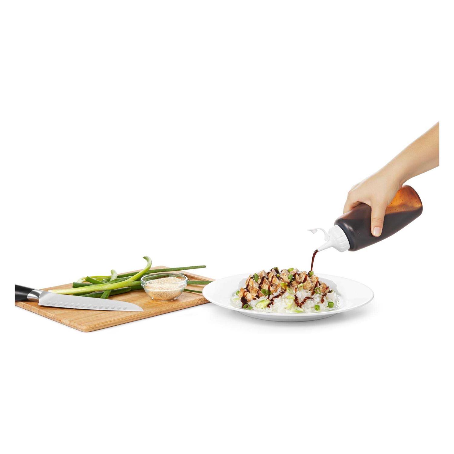 The OXO Chef’s Squeeze Bottles are perfect for oil, chocolate, condiments and more. The cap is attached, meaning you can snap it on to shake or store, or pop it open with one hand to pour without worrying about losing it. The BPA-free Squeeze Bottle lid is interchangeable between sizes. The durable, reusable bottles feature convenient markings for mixing and measuring, and the collar and pour spout disassemble for easy cleaning.