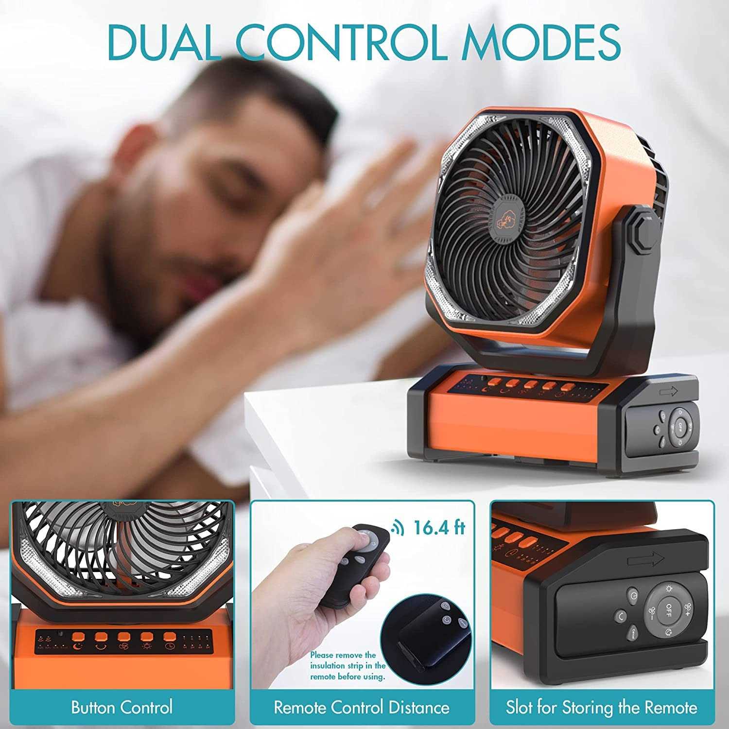 Powered by 20000mAh rechargeable battery and compose of 16 LED light beads, with double triblade and 270° pivot design. Made of sturdy and durable ABS material for anti-drop and anti-collision. The fan is a good helper for jobsite, camping trip, fishing, barbecue, power outage, hurricane and also for indoor use as a desk fan when studying, working, reading, etc. Color: Orange.