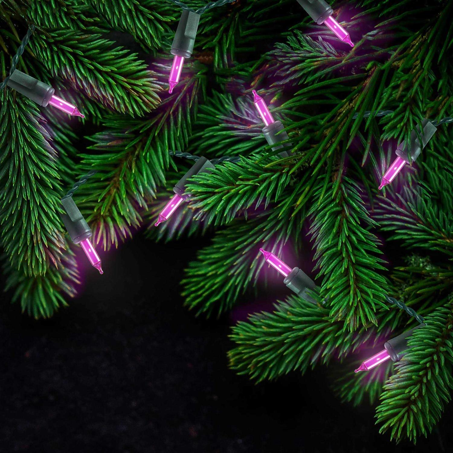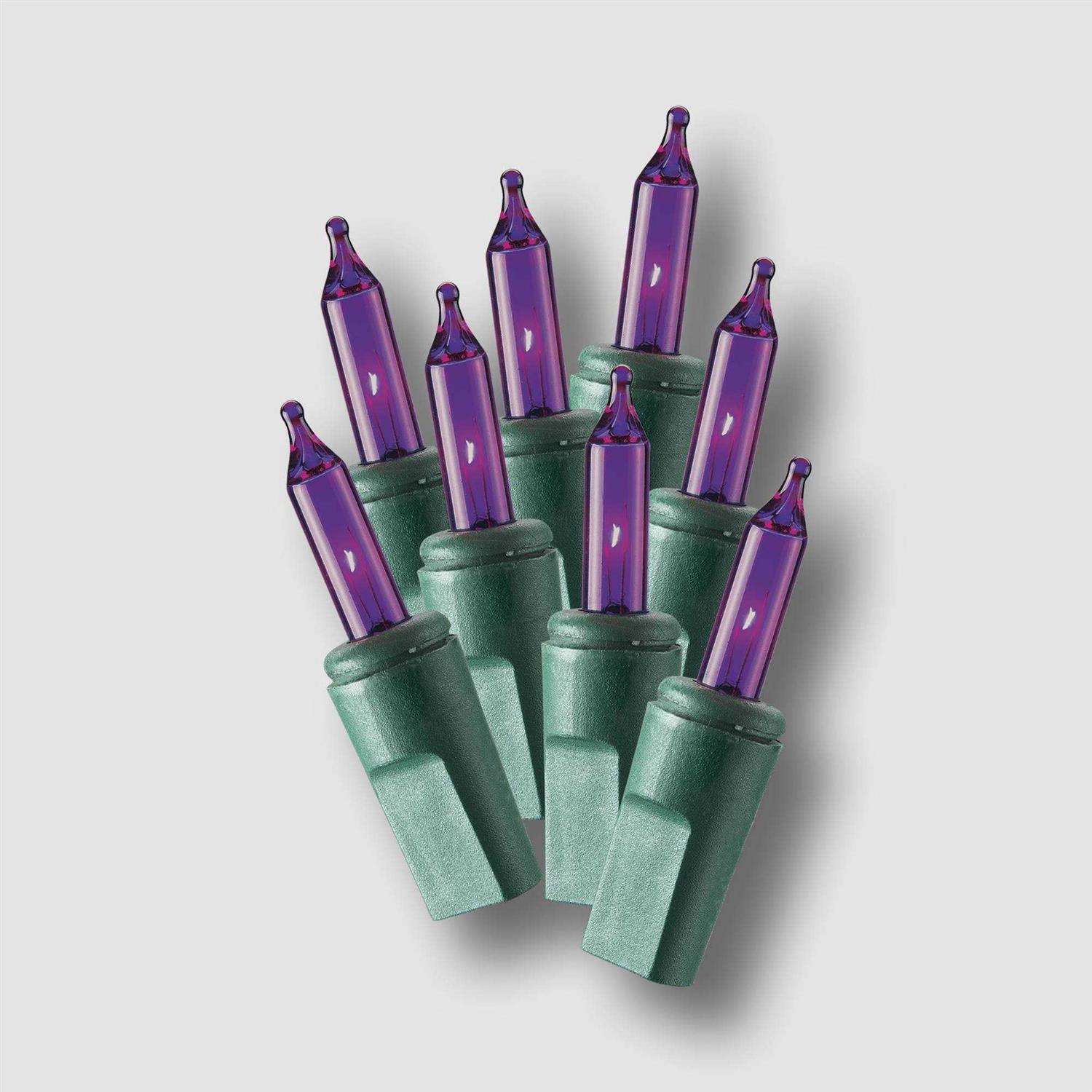 Create a festive glow with your holiday decorations with the Philips 100LT Mini Bulbs in purple color with green wire. These energy saving lights are Energy Star rated for use both indoors and out. Strings have a lighted length of 24.7′ and a total of 11 sets can be connected end to end for a total of 1,100 bulbs.