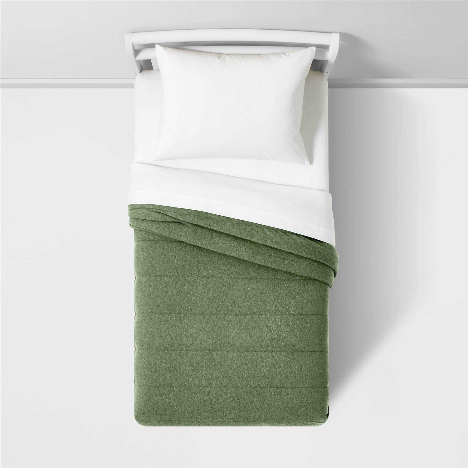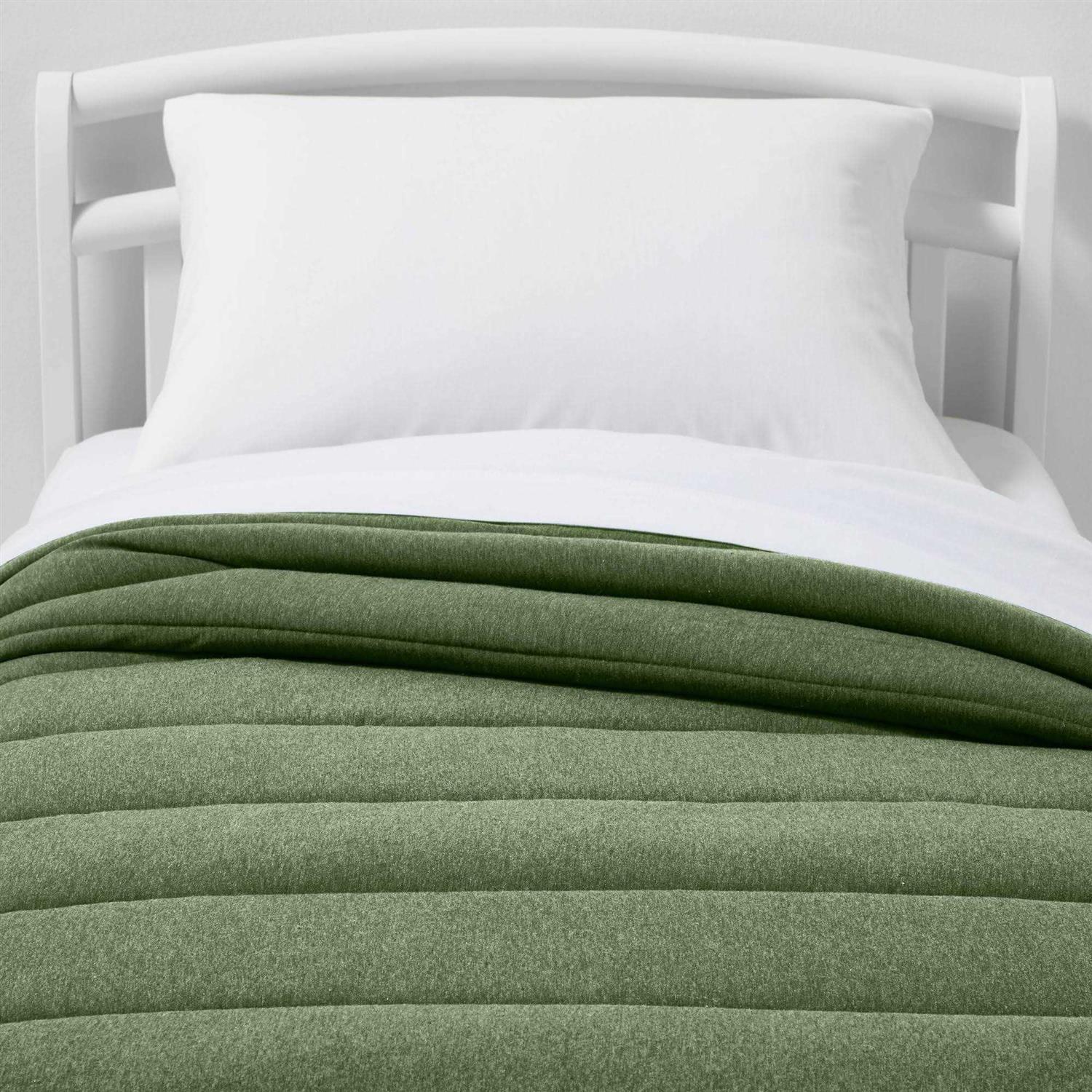 Give your child’s bed a modern refresh with this Channel Jersey Comforter from Pillowfort . This comforter features a quilted channel stitch pattern for a cozy and textured look, and a fern green color to give a soft touch to their bedding. The knit jersey fabric offers soft and comfortable year-round use, while the fill insert adds a layer of warmth to the top of their bed. Coordinate with white sheets and a matching pillow sham to complete their bedding ensemble, and machine wash for easy care.
