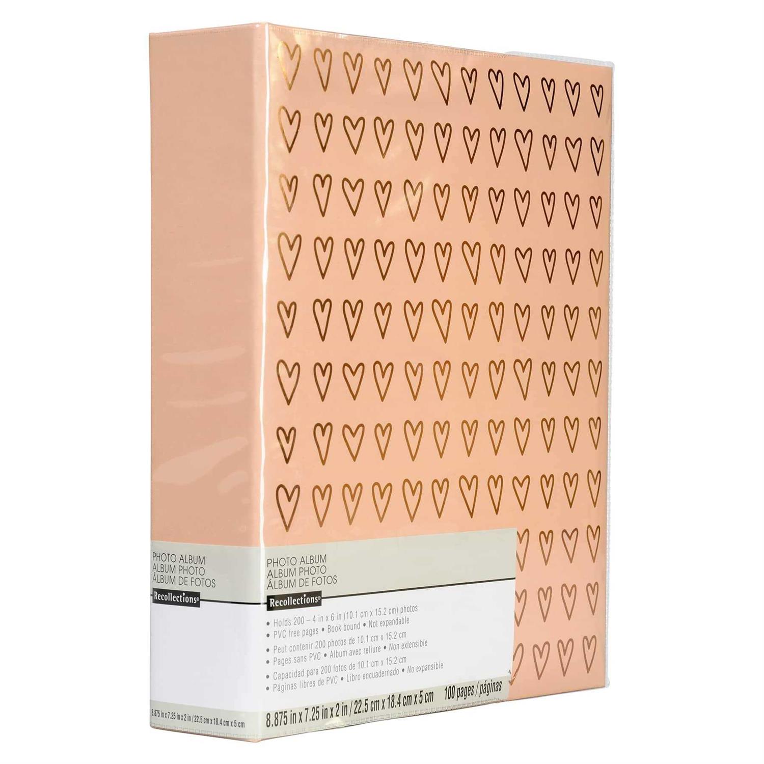 Pink with Rose Gold Foil on Front Cover 8.88″x 7.25″ x 2″ Holds 200 4″ x 6″ (10.1 cm x 15.2 cm) photos 50 PP inner sheets You can use this adorable album to display your birthday or wedding photographs. Rose gold foil hearts lend some shimmer and charm to the cover of this photo album by Recollections. You can use this adorable album to display your birthday or wedding photographs.
