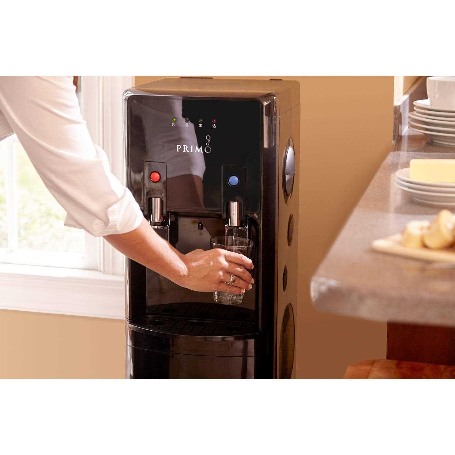 Sleek design and convenience meet with the Primo Deluxe Bottom Loading Water Dispenser with automatic self-sanitization. This bottom-loading water cooler provides access to ice cold or piping hot water in an instant with easy-to-use paddle controls, which offer fast flow dispensing to fill pitchers or large sports bottles in seconds. Simply place the drip tray, load a 5-gallon bottle of water and start hydrating in no time–no plumbing or installation required. Whether you choose a 3- or 5-gallon bottle of Primo Purified Water with Minerals or you refill your own bottle at a Primo Self-Service Refill Station, our multi-step reverse osmosis process ensures you’ll be drinking high-quality water. To help you get started, we’ve included coupons with your dispenser purchase to try both options at one of thousands of retail locations in the U.S. Start drinking more water with this Energy Star Rated, bottom-loading water dispenser today!
