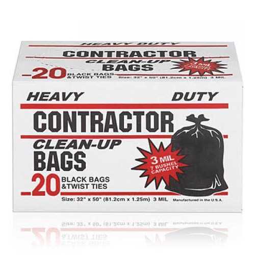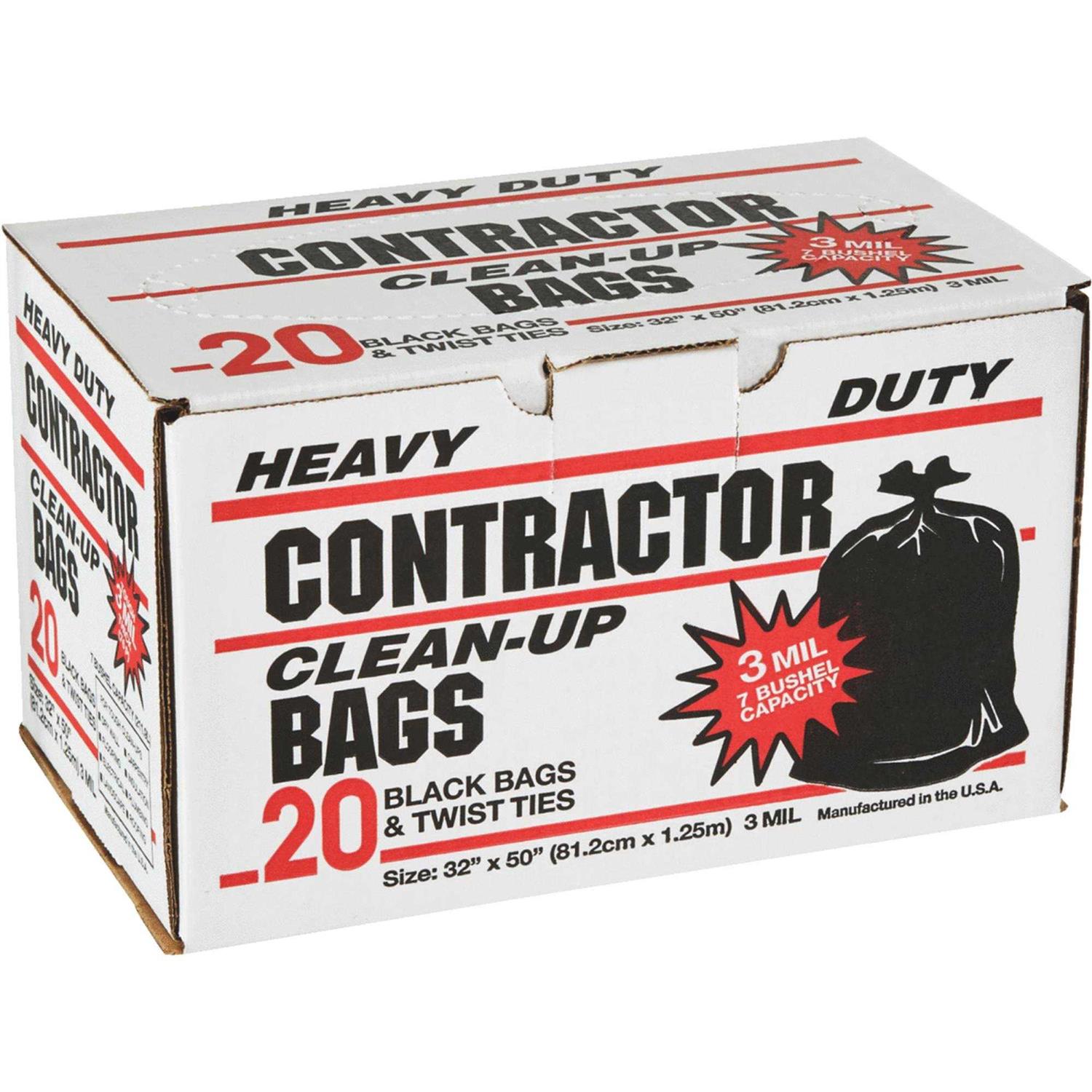 Primrose Contractor Black Twist Tie Trash Bags are designed to help you clear and clean up any debris from your lawn and home. For convenience, these plastic bags have a round opening that can be folded around a trash can to easily place debris in. When the trash can is full, these bags can be easily tied with its flap tie closure. Able to hold a large capacity, these bags are ideal for trash, yard clean-up, storage, donations, and more. These multipurpose bags are also a useful cleaning mechanism for contractors while they are on the job. Has a 7-bushel capacity and measures 32 In. H. Comes in a package with 20 individual black plastic bags.