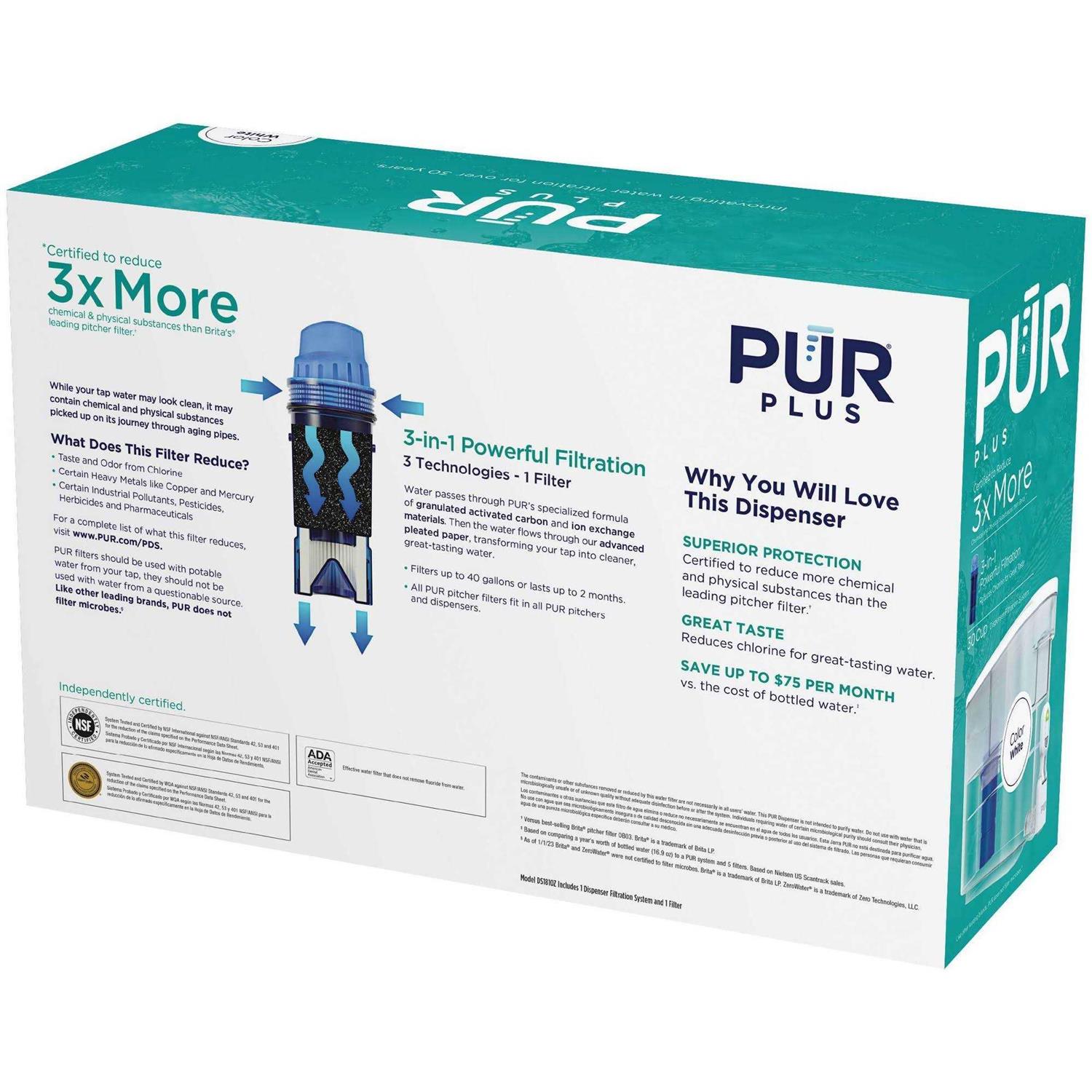 Highlights Large, 30-cup capacity with slim design to easily fit in your refrigerator. Hassle-free design: pull down spout, carrying handle, and filter change light. BPA free and dishwasher safe. LockFit design to ensure unfiltered water doesn’t mix with filtered water. Includes 1 Genuine PUR PLUS Dispenser Filter with 3-in-1 powerful filtration technology. Certified to reduce 3x more chemical & physical substances than Brita * for better tasting water. Reduces chlorine, copper and zinc that cause bad taste and odor. ** NSF certified to reduce microplastics found in tap and bottled water. ** Compatible with all Genuine PUR Pitcher & Dispenser replacement filters. Saves you up to $75 a month and reduces plastic waste versus bottled water. *** Specifications Dimensions (Overall): 10.38 Inches (H) x 15.38 Inches (W) x 5.75 Inches (D) Weight: 3.5 Pounds Water Filtration Compatibility: Pur Pitcher Filters Filters: Unpleasant Odors, Mercury, Unpleasant Tastes Capacity (Volume): 30 Cup Features: Water Purification: BPA-Free Maximum Filter Life: 2 Months Material: Plastic Care & Cleaning: Spot or Wipe Clean – Auction PUR Plus 30-Cup Dispenser Filtration System