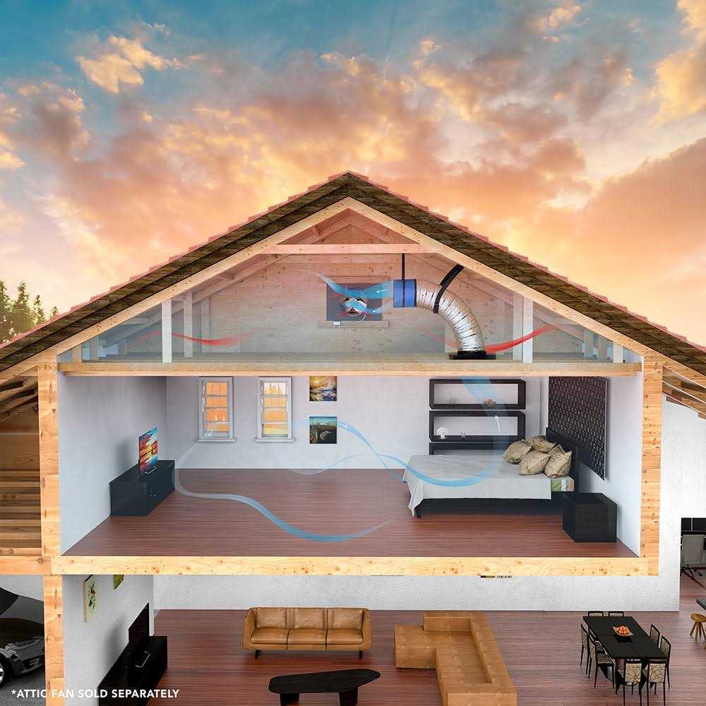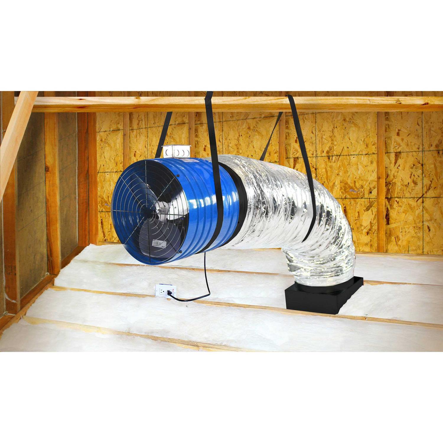 - Fan motor head hangs from the rafters in the attic with a small ceiling cut-out for the air intake grille (14 in x 14 in ceiling cut-out)