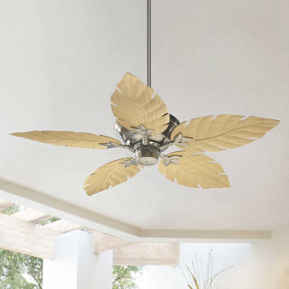 The beauty of nature inspired the look of the Quorum Monaco ceiling fan collection. The textured, leaf-shaped blades make it an excellent fit for adding comfort to outdoor living spaces. Choose from 5 different finish options. Wet area rating means this fan can be directly exposed to the elements.
