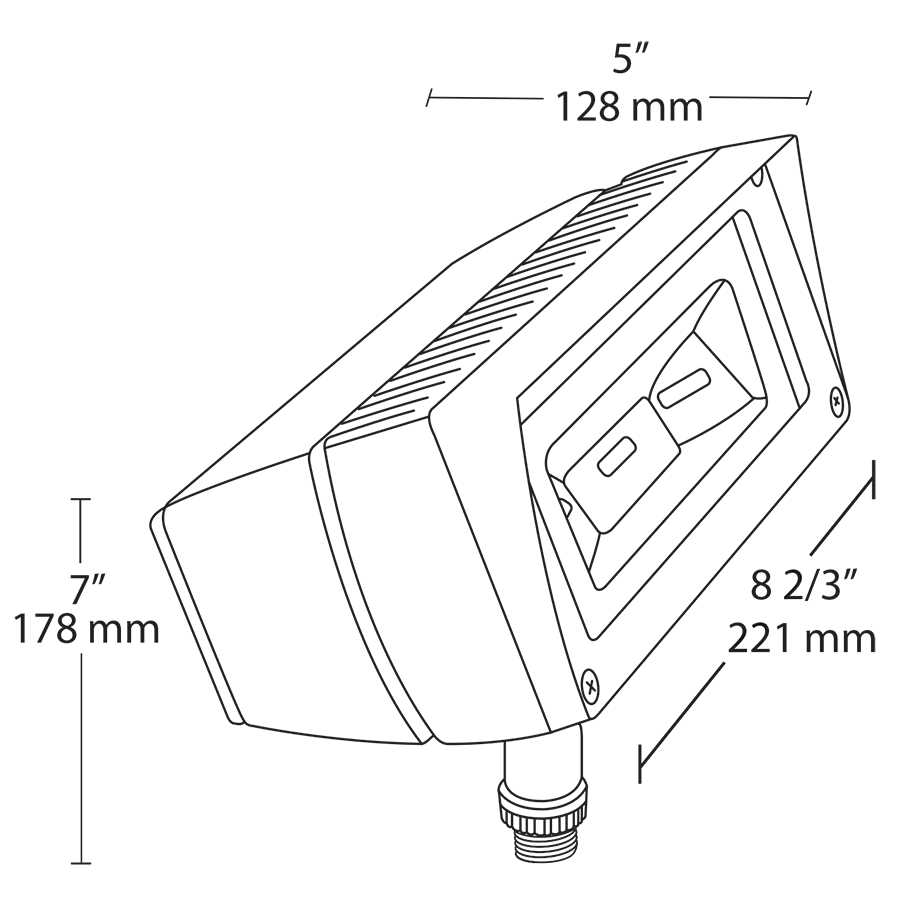 Rab Future Flood Series Horizontal/vertical beam distribution LED flood light in bronze polyester powder coated finish, has die-cast aluminum housing, lens frame and mounting arm, high-temperature silicone gasket for added durability. It has a voltage rating from 120 to 277-Volts AC. The 18-Watt LED lamp delivers a cool white light output of 2429-Lumens with 5000K color temperature and 71 CRI. It has an average life of 100000 Hours. It uses constant current, class 2 driver for dimming function. The arm mountable LED flood light measures 8-2/3-Inch x 5-Inch x 7-Inch. It has power factor of 98.7% at 120-Volts, 91% at 277-Volts and efficacy of 123.3 LPW. It is suitable for wet locations. IP66 rated LED flood light meets UL, IESNA LM-79 and LM-80, RoHS standards.