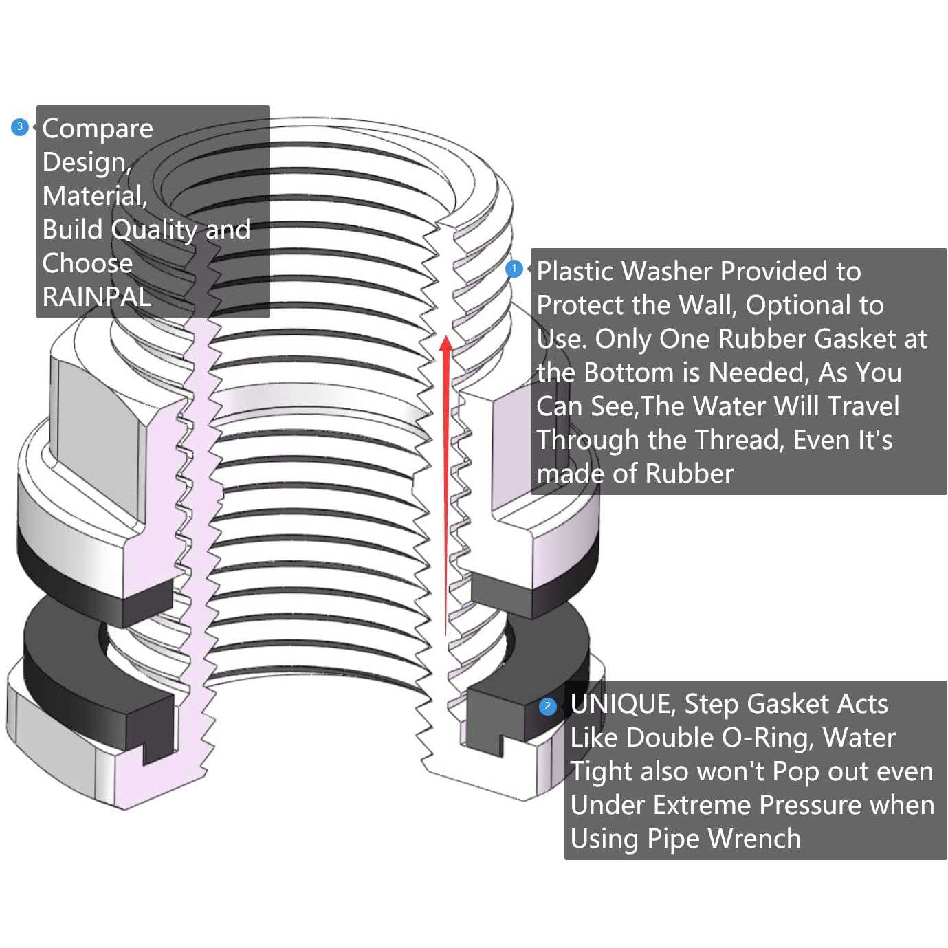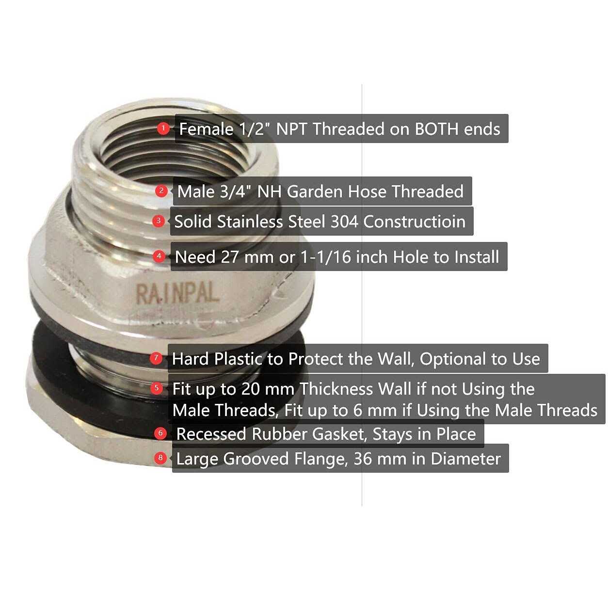 Solid Stainless Steel 304 Material, Lead Free Male 3/4″ Garden Hose Threaded Female 1/2″ NPT Threaded on BOTH Ends Heavy and Heavy Duty, 3.7 oz each, Compare Weight, Quality and Choose RAINPAL Compare Design, Material, Quality and Choose RAINPAL RAINPAL SSBF020 Stainless Steel 304 Bulkhead Tank Fitting (Double Female 1/2” NPT and Male 3/4″ NH Garden Hose Threaded) (2)