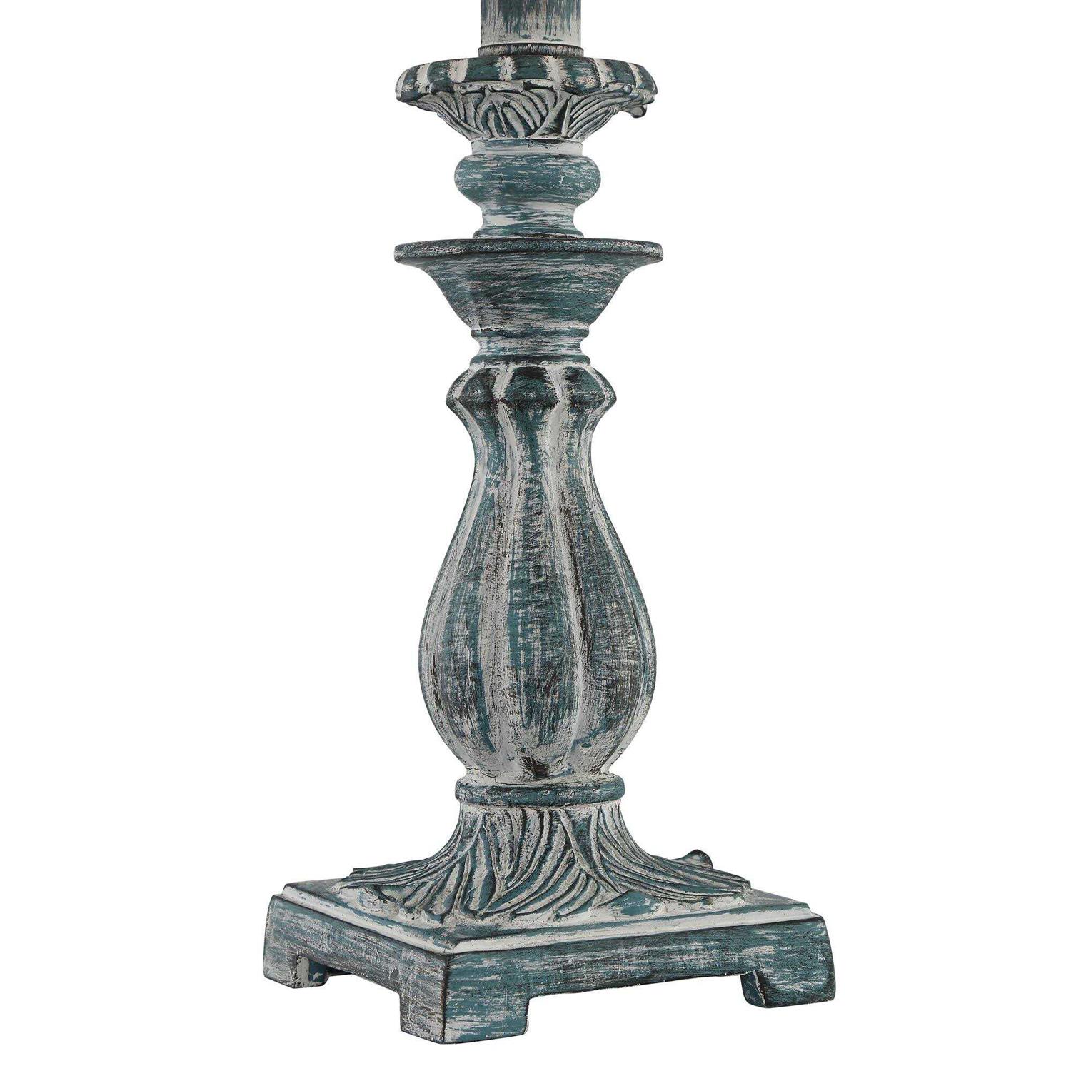 From Regency Hill these traditional accent table lamps come in a convenient set of two. Each lamp has an elegant candlestick inspired frame with worn carvings for a more elaborate design. An antique blue finish is rubbed on to give it an aged look. White bell shades on top are the perfect finishing touch to this beautifully old-fashioned design.