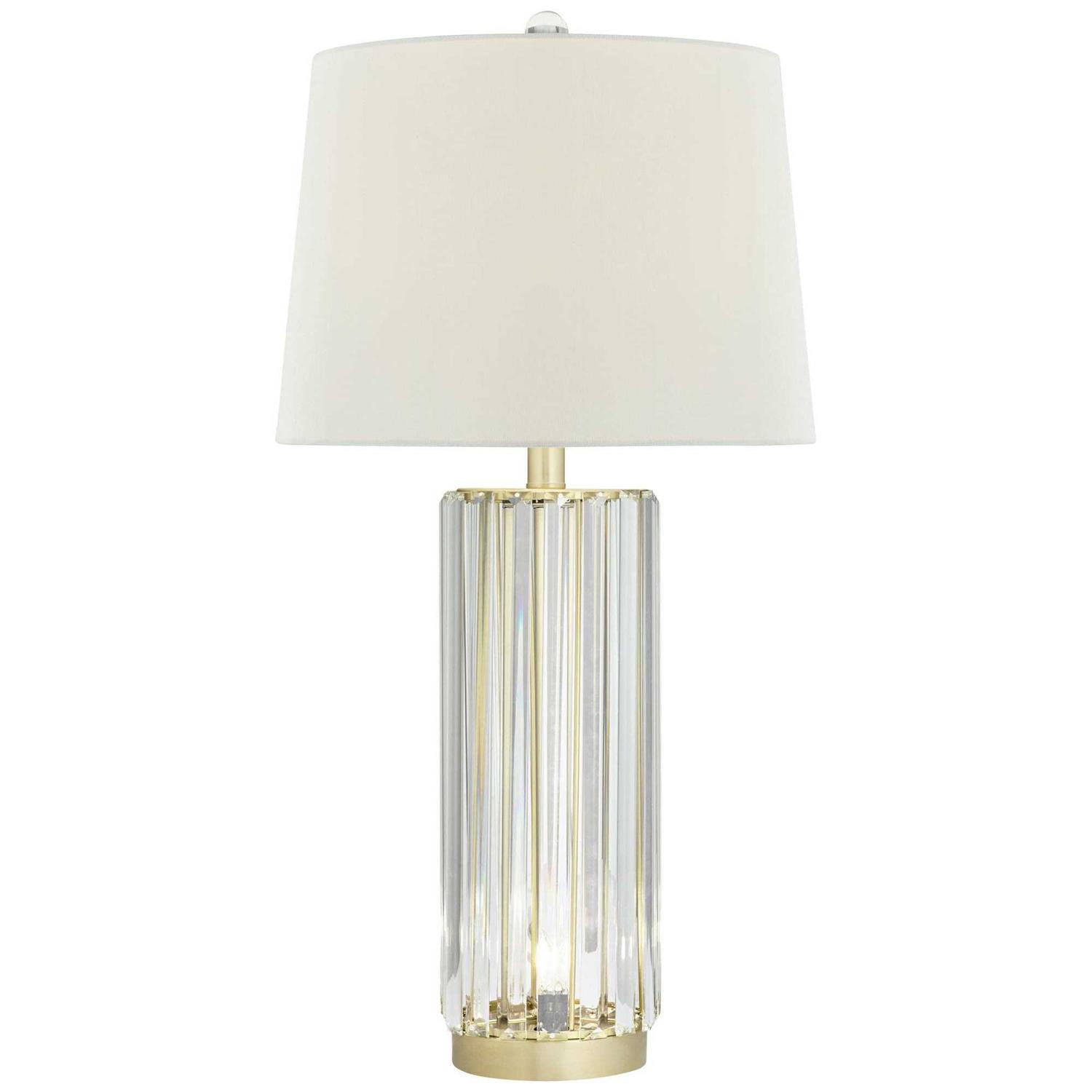- Clear glass rod lamp body. Gold finish over metal construction.