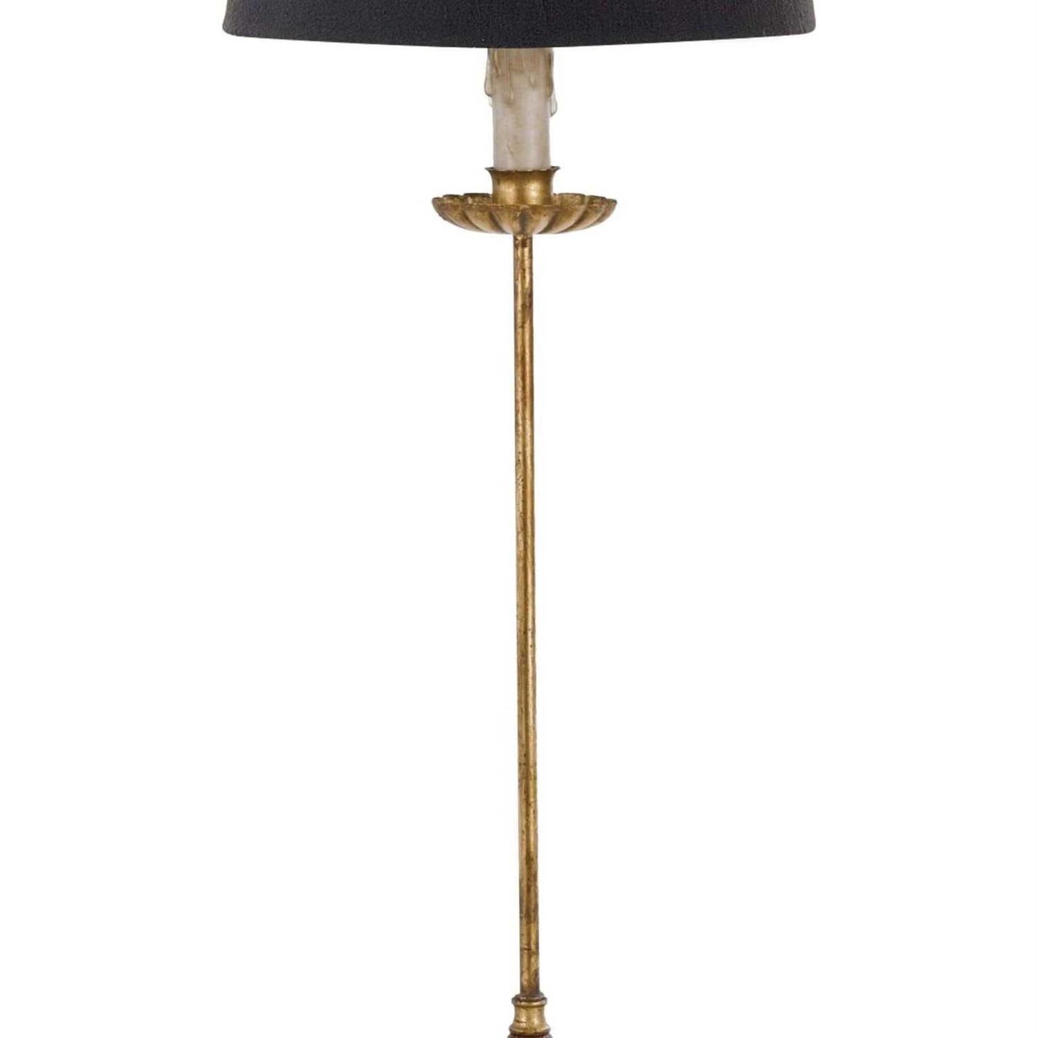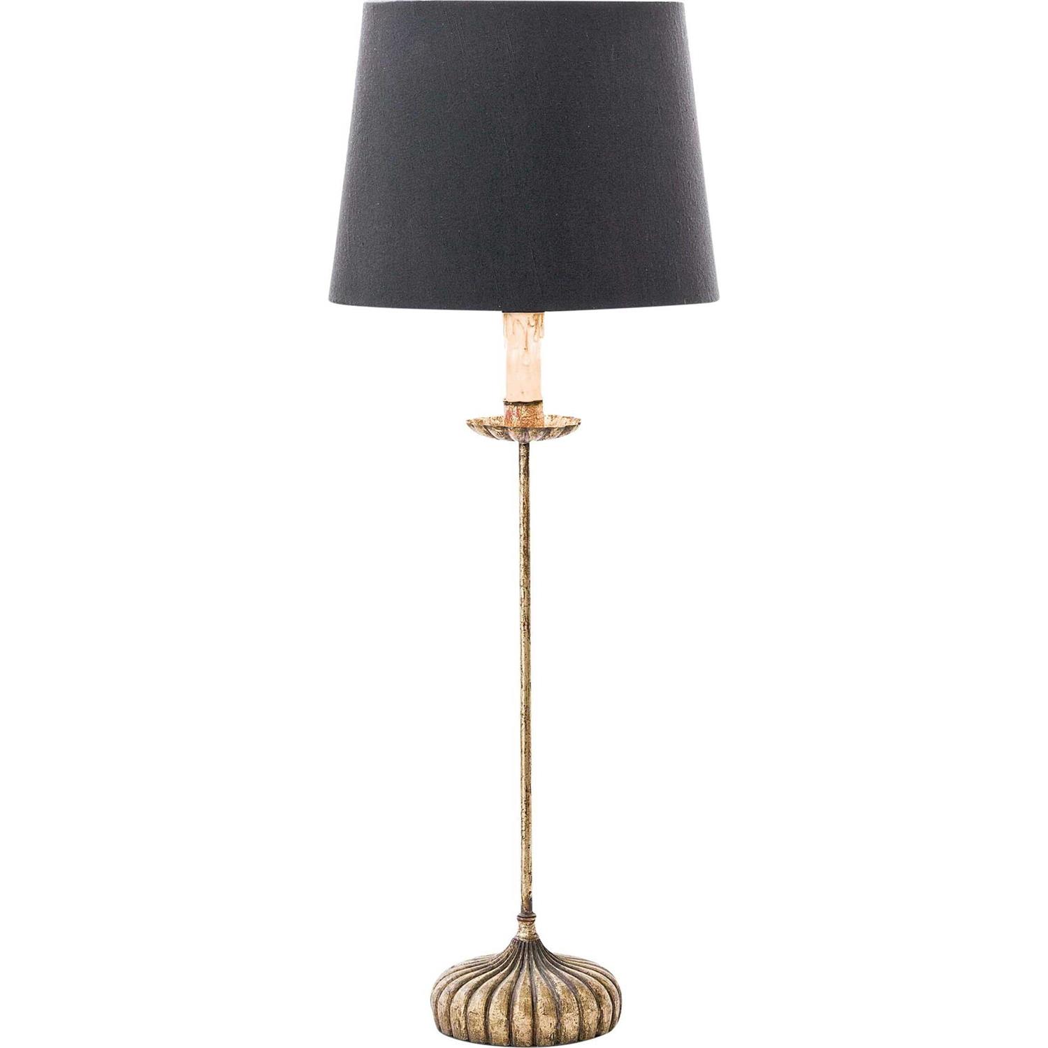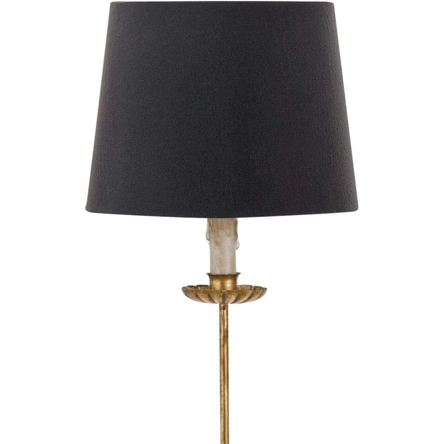 Clove Stem Buffet Table Lamp measures 28.5″H x 11″W x 11″L. Base is made from cast iron and finished with a vintage gold leaf. With drama and flair this table lamp looks wonderful in a pair on a buffet or console table and brings a classic vintage design with the faux dripping candle. A black linen shade gives the lamp a touch of sophistication.