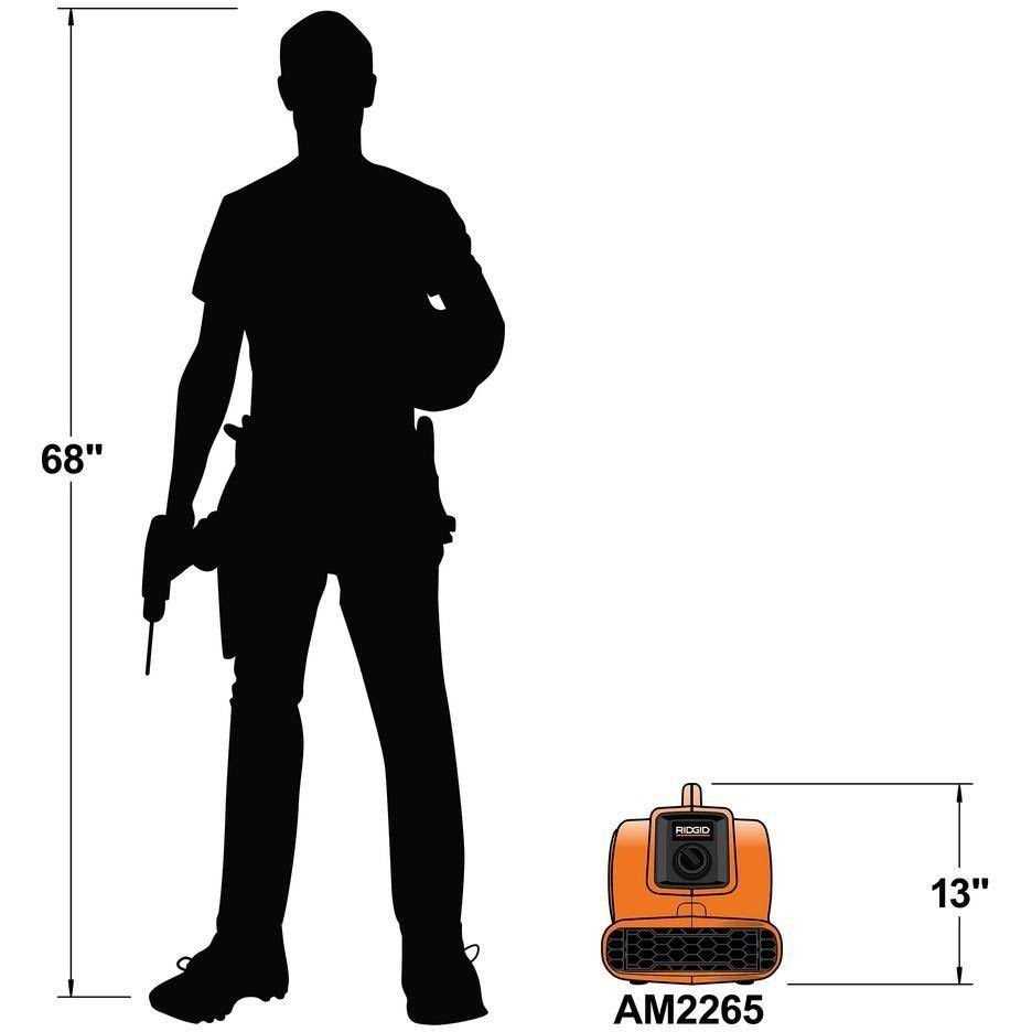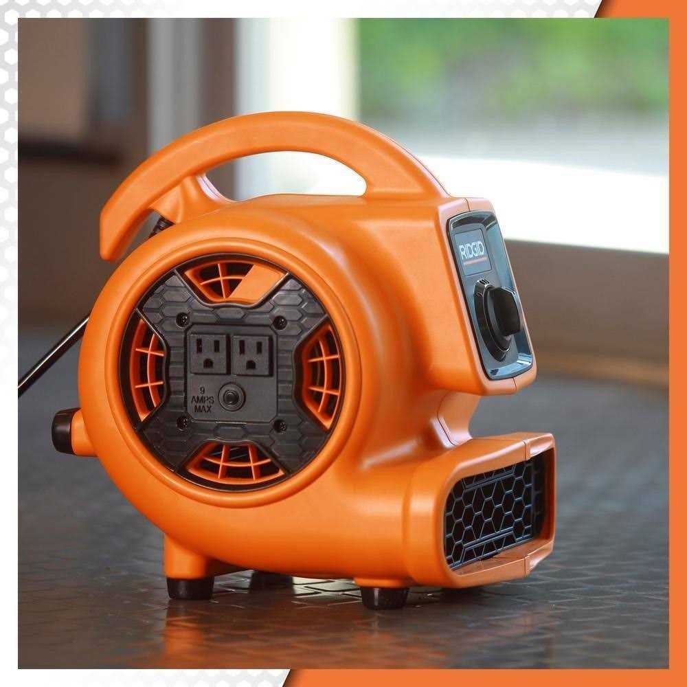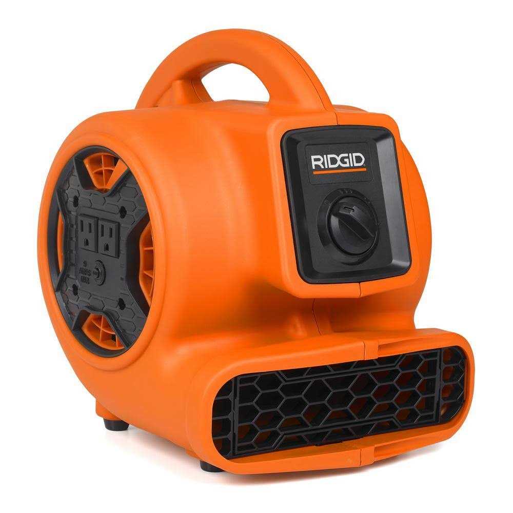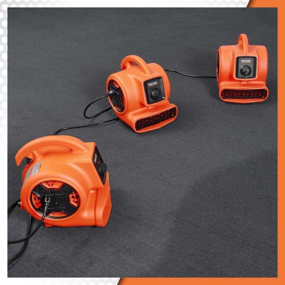 The RIDGID AM2265 Compact Air Mover is a versatile tool that is perfect for professionals, and DIYers who want high volume air movement to tackle a variety of tasks. This compact blower fan offers 3 speeds with an average of 600 CFM (cubic feet per minute) of airflow on the highest speed setting that is dispersed quickly over a large area. This air mover can be used to quickly dry a variety of wet surfaces such as floors, carpets or rugs, paints or stains, and drywall mud. The integrated power outlets allow you to daisy-chain up to three AM2265 Air Movers together, eliminating the need for extension cords when drying large areas. The power outlets can also be used to connect appliances, tools, and other devices requiring power; up to an 8.9 Amp max outlet rating. This Air Mover can also help ventilate workspaces, creating a cooler and cleaner working environment. The stackable design allows you to easily stack up to three units for storage or transport.
