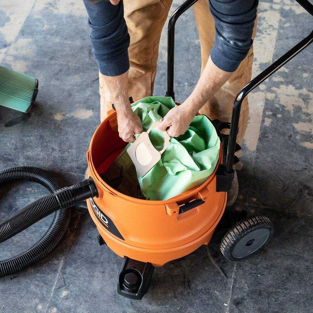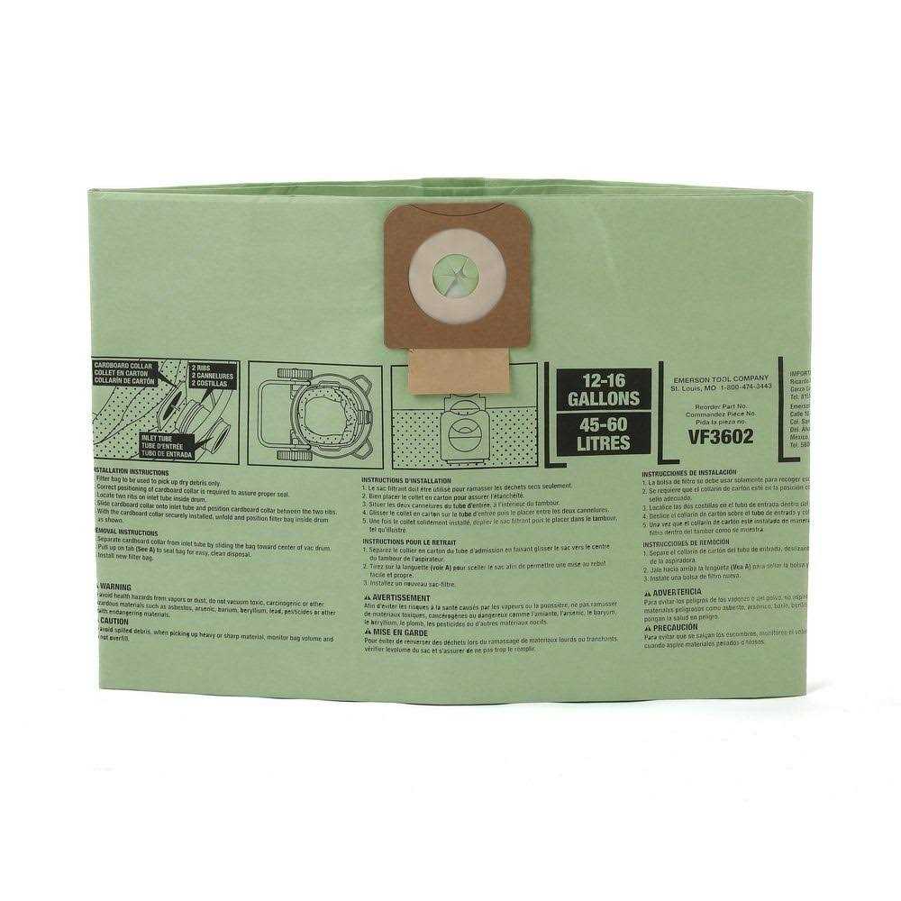 The RIDGID premium cyclonic dry pick-up dust bags achieve HEPA-level filtration up to 99.97% at 0.3 microns and larger in select RIDGID 12 Gal. to 16 Gal. wet dry vacs when installed with the RIDGID VF6000 filter. These dust bags help you capture and clean up fine particles such as concrete dust, drywall dust and fine powders while keeping the vacuum drum clean and the particles out of the air. Dust bags facilitate cyclonic airflow, resulting in pre-separation and more equal distribution of fine particles and debris throughout the bag. The sealing collar feature allows for clean and easy debris disposal. Simply remove the bag and use the collar to seal the debris inside the bag. See list of select vacs listed below.