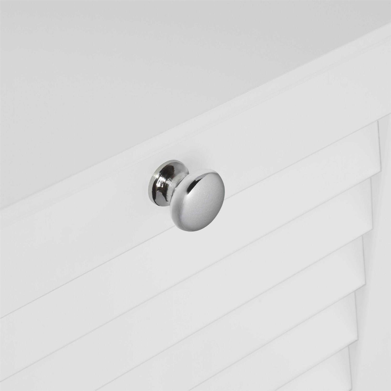 - Features a traditional shutter door design, polished silver knobs, white painted finish and inset side panels.