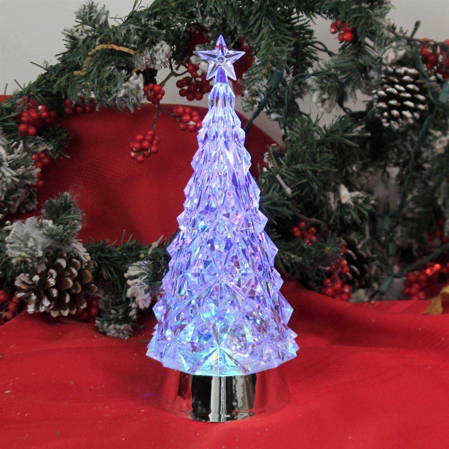 Roman Battery Operated Tri-Color Tree with Star is an elegant decoration for the Christmas and holiday season. This glass tree has the ability to light up with three colors, giving the room a settle colorful glow. Place on mantels, tables, shelves, and any other surface that needs some added decoration, great to use for a winter wonderland theme. Can easily pair this tree with other Christmas decor to create a seasonal display.
