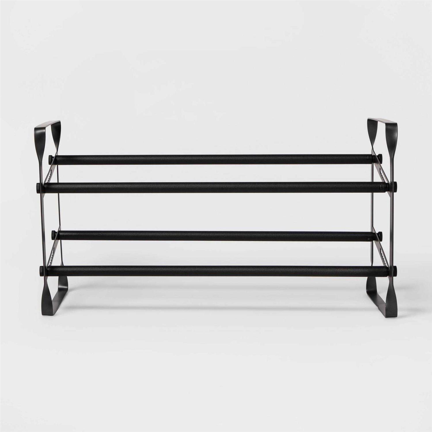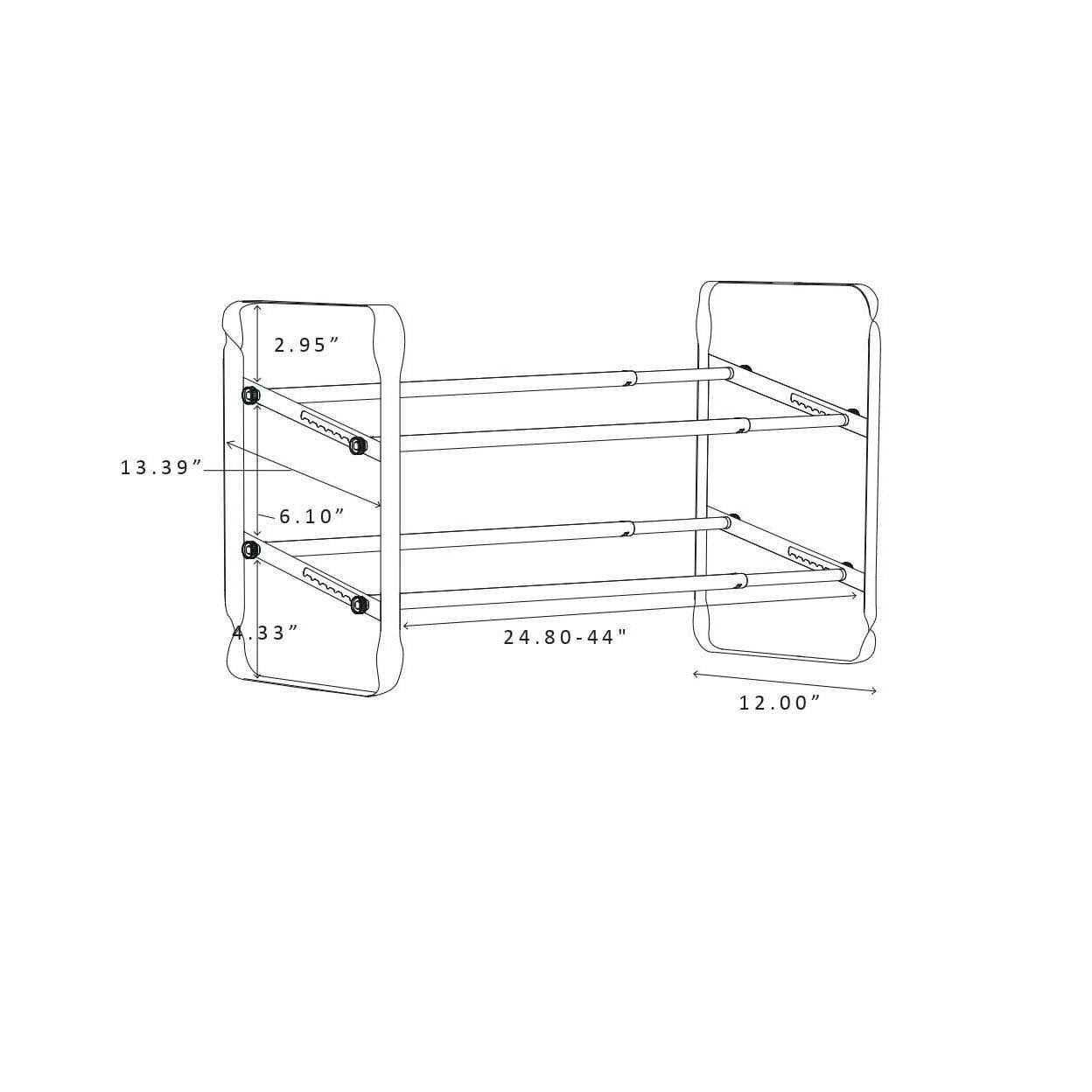 This gunmetal shoe rack features a sturdy construction in a polished black finish, creating a timeless look that easily pairs with the rest of your decor. It’s designed with two tiers, giving you the ability to hold up to 10 pairs of shoes — plus, each tier is made from two expandable bars, helping you adjust the size to suit your space. Whether you place it in your entryway or use it on your patio, you’ll appreciate having this shoe rack in your interior. Overall Width: 24.8-46 inches Overall Height: 13.46 inches Overall Depth: 12.2 inches Distance from floor to bottom: 4.33 inches Distance between front legs: 24.5-44 inch Distance between front leg and back leg: 12 inches
