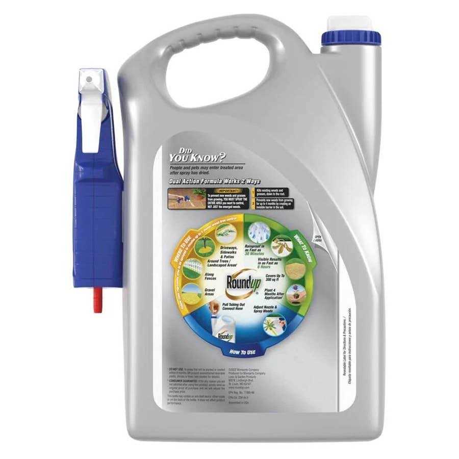 Roundup Dual Action Weed & Grass Killer with Trigger Sprayer Plus 4 Month Protection kills existing weeds and grass down to the root and prevents new weeds from growing for up to four months by creating an invisible barrier in the soil. You will see results in as fast as six hours with one application. You should apply only where you want to kill existing weeds and prevent future ones, such as cracks and crevices in driveways, sidewalks, and patios, along fences, in mulched beds, or around the base of well-established desirable plants, shrubs, or trees, and on gravel areas. In order to prevent new weeds and grasses from growing, you must spray the entire area you want to control. All ornamental bedding plants, trees, shrubs, sod, and seeds can be planted four months after application. For best results, apply during warm, sunny weather above 60 degrees Fahrenheit. Comes in a 1 gal. container with a trigger sprayer for precise applications.