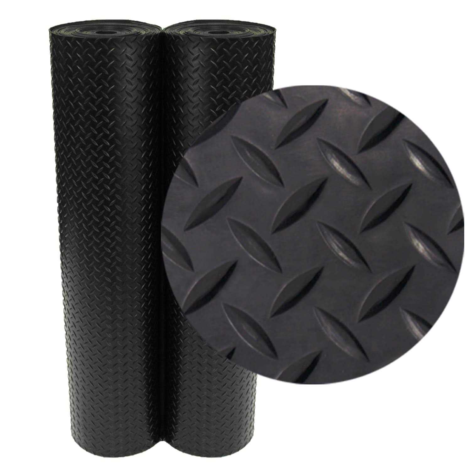 The ³Diamond-Plate² is designed after the classic metal diamond-pattern design. This is a regular pattern of raised diamonds that imbue the industrial aesthetic. Our rubber floor mats are made to floor and protect surfaces just like their metallic forefathers. But with rubber runners, the end-user has the benefits of a forgiving surface that will absorb impact and shock at ultra-affordable costs. Rubber protector mats help safeguard floors and the equipment on top of the floors. Unlike metal, rubber matting will not ding, dent or permanently damage either the floors or the equipment when materials are dropped onto it. Used on stairs and catwalks in industrial settings, the added texture reduces the risk of slipping. For this reason ³Diamond-Plate² rubber floor mats are frequently used on the interior of vehicles or trailers. The ease of installation makes this product an even more popular choice amongst cost-conscious consumers, since the use of adhesives and installers is not needed. This rubber matting is made from 100% synthetic rubber and that allows it to be used in outdoor walkways without worry. Being offered in 8 varied lengths minimizes product loss (due to cutting) and installation costs. Buy one of these rubber floor mats for their superior functionality and enjoy the classic industrial design for years to come.
