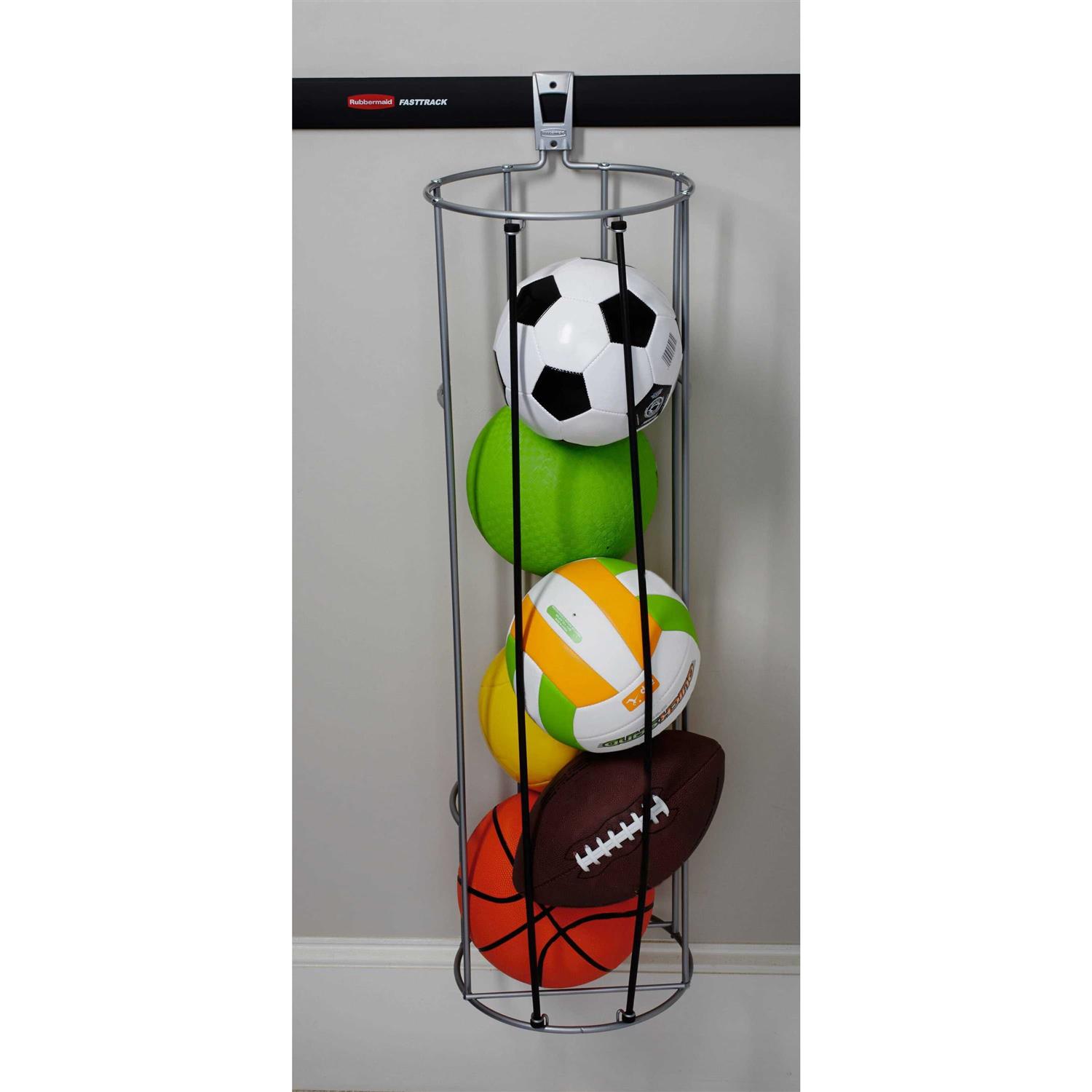 Part of the Rubbermaid FastTrack Garage Organization System, the Rubbermaid Vertical Ball Rack provides secure, space-saving storage for all kinds of sports balls. This ball rack has flexible bungee cord bands that ensure quick, easy access to any ball. It quickly snaps into place on a FastTrack rail and can also be mounted directly to the wall (hardware not included) and holds up to 50-lbs. This ball rack features durable powder-coated steel construction, while a soft grip coating helps prevent nicks and scratches.