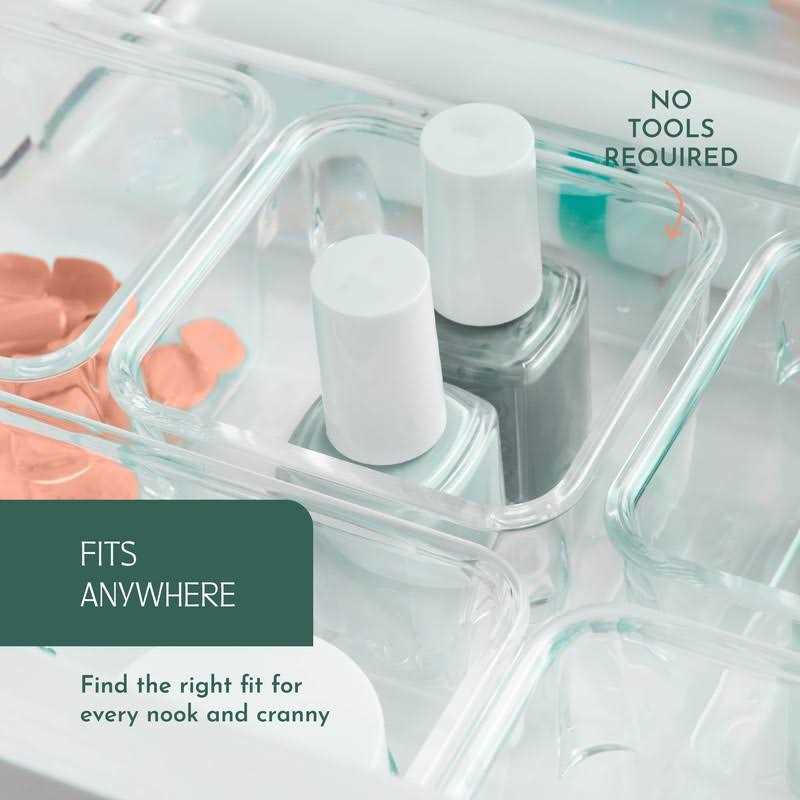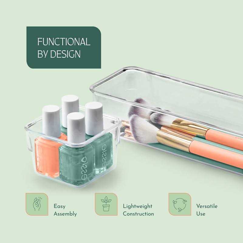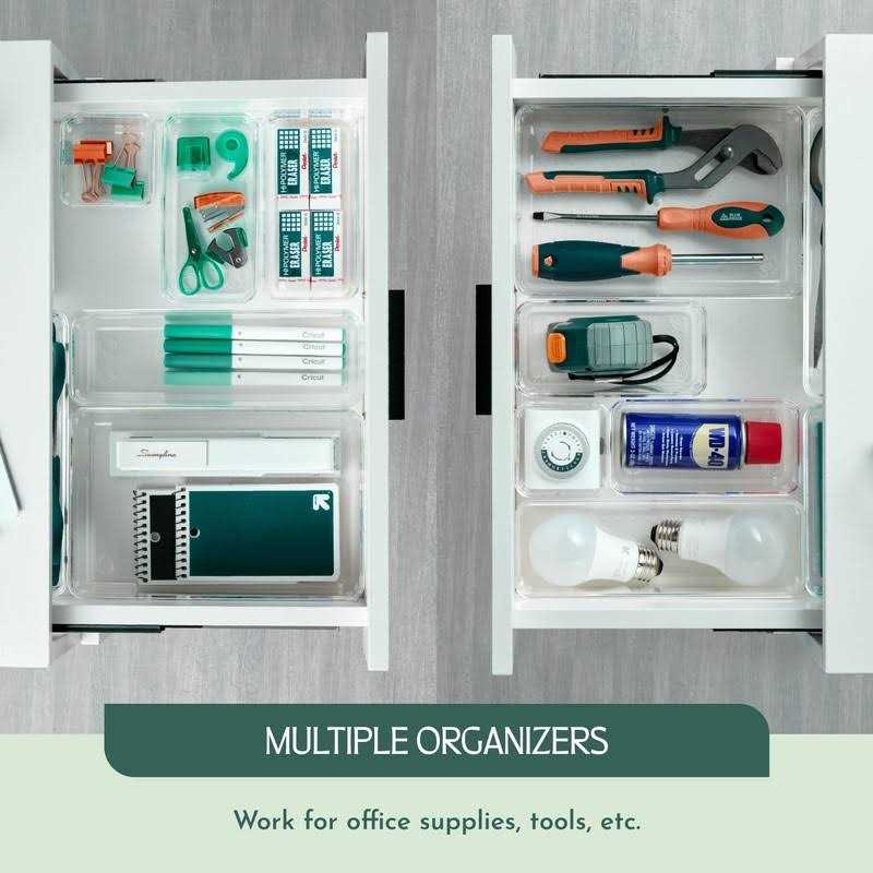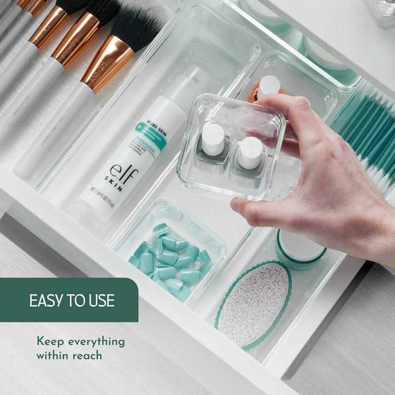 Multiple Drawer Organizers – 25 various sizes clear containers for organizing every drawer in your bedroom, kitchen, study, or bathroom. Keep cosmetics, makeup tools, jewelry, office supplies, and hair accessories tidy and within easy reach.