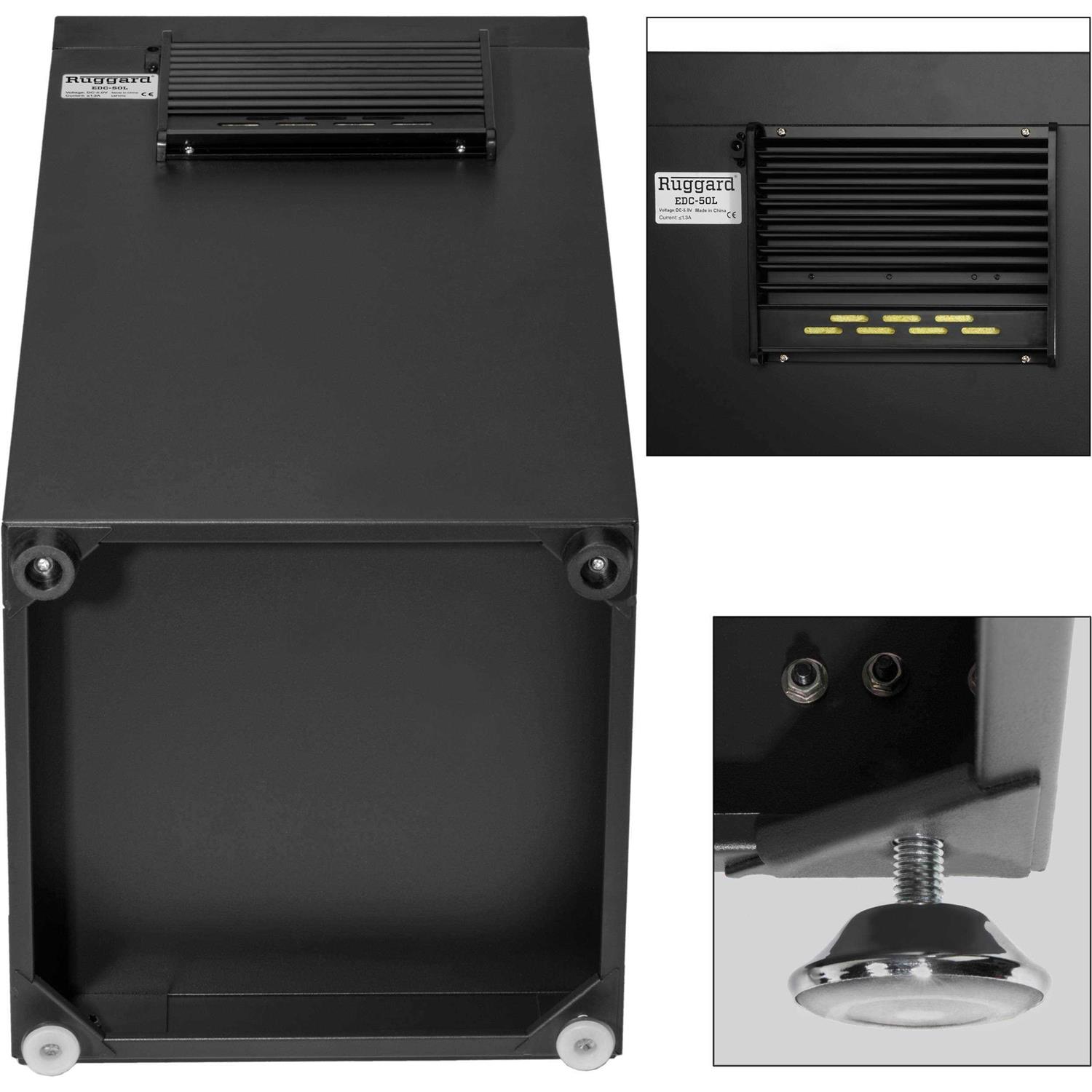 Protect your lenses, photographic and optical equipment, mobile electronics, and other valuable accessories from excessive moisture, dirt, and dust with the Ruggard 50L Electronic Dry Cabinet. The cabinet’s fast-acting TE Cooling Wafer regulates the interior’s relative humidity from 35-60% to help prevent fungus and corrosion that can damage your gear. Humidity adjustments take place over a 1- to 3-hour period. Fully-featured, the cabinet has a lockable, rubber-sealed glass door, with two keys, and a front plastic handle. A large, dimmable LCD displays ambient temperature (in Fahrenheit or Celsius), relative humidity, and other settings. Interior LED lights make viewing and finding gear easier, and both the base and the two adjustable plastic shelves are padded to help guard against scratches. The Electronic Dry Cabinet is powered by an included multi-voltage power supply. In addition to being near silent, without a fan or compressor to make noise, the unit is also dripless, eliminating the need for a water tray. To prevent unwanted movement, the bottom of the cabinet has four rubber feet and two are leveling feet for installing on uneven surfaces.