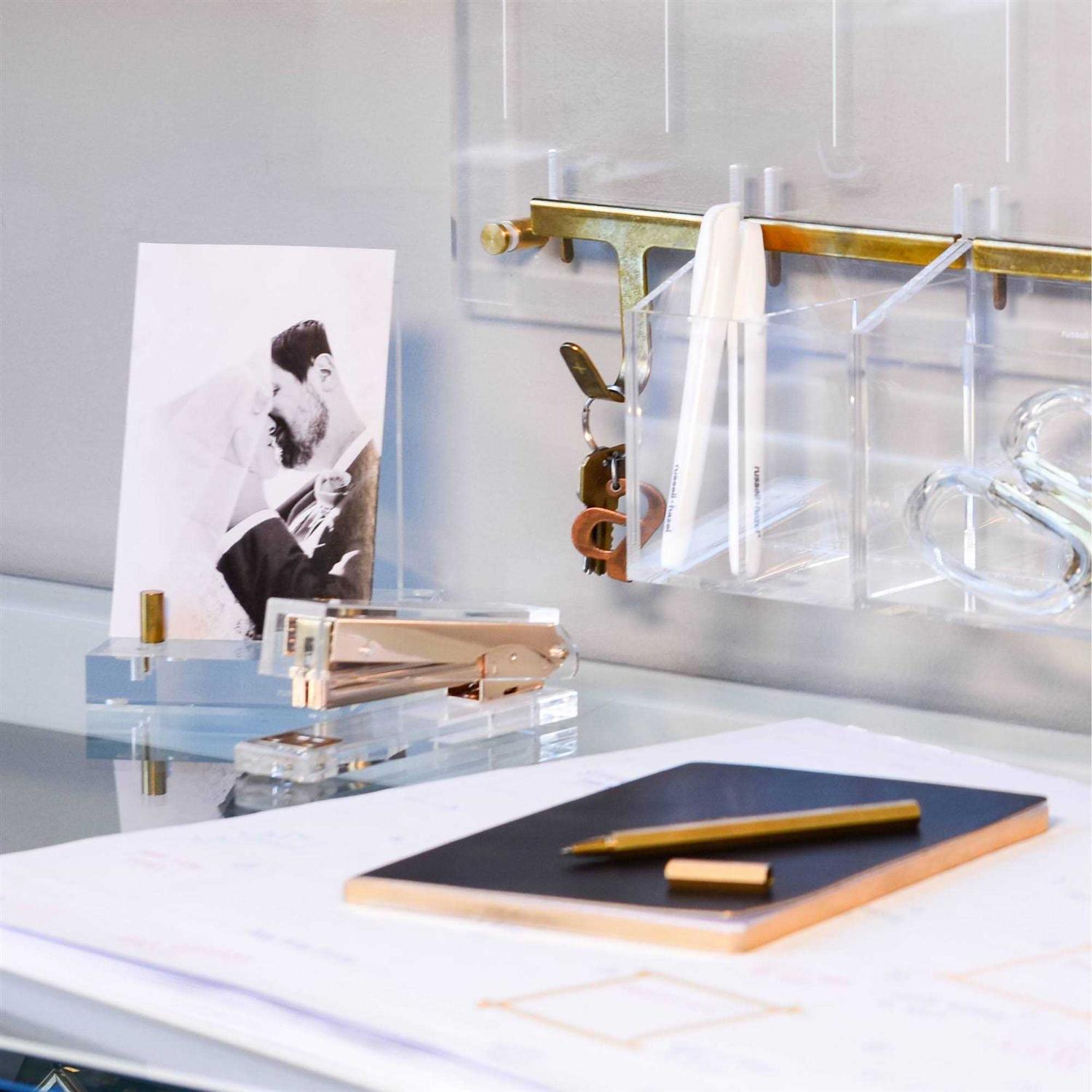 - Where style meets substance; crisp modern design realized in brass to match the hardware of our acrylic accessories
