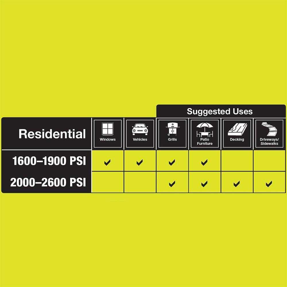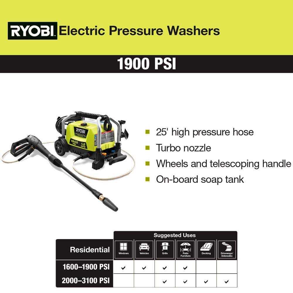 Pressure Washers by RYOBI. Details:The RYOBI 1900 psi Electric Pressure Washer is the perfect combination of portable, lightweight and durable. The frame features wheels and a telescoping handle allowing for easy transport, making this a great choice for use around your patio and decks as well as boats, campers and other recreational vehicles. A powerful turbo nozzle, 15 nozzle and soap nozzle are all conveniently stored on the unit for easy access. An on-board detergent tank offers easy soap application and the 25 non-marring hose allows you to easily access even more area. The pressure washer is able to sit vertically for compact storage when the job is done.