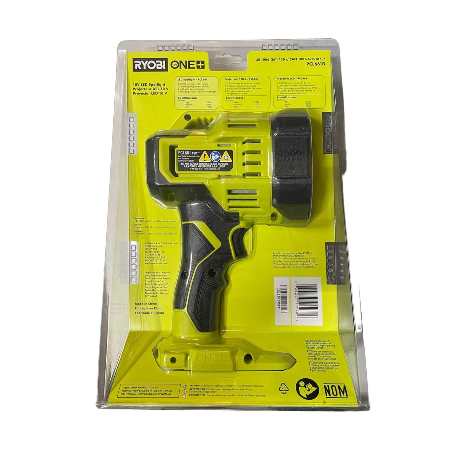 The RYOBI 18V ONE+ Cordless LED Spotlight provides a convenient, portable light source around the house, workshop, or the jobsite. This battery-powered light features a high-intensity LED that emits bright, soft light on the entire work area and can be used in a high or low setting for customizing brightness. This worklight also incorporates an on-board handle to enable convenient storage, carrying and placement for multiple lighting applications. The 18V ONE+ Cordless LED Spotlight is sold as a tool-only, allowing you to build on your ONE+ collection of cordless innovated tools. Best of all, like every RYOBI 18V ONE+ tool the 18V ONE+ Cordless LED Spotlight works with any 18V ONE+ battery. Battery and Charger sold separately