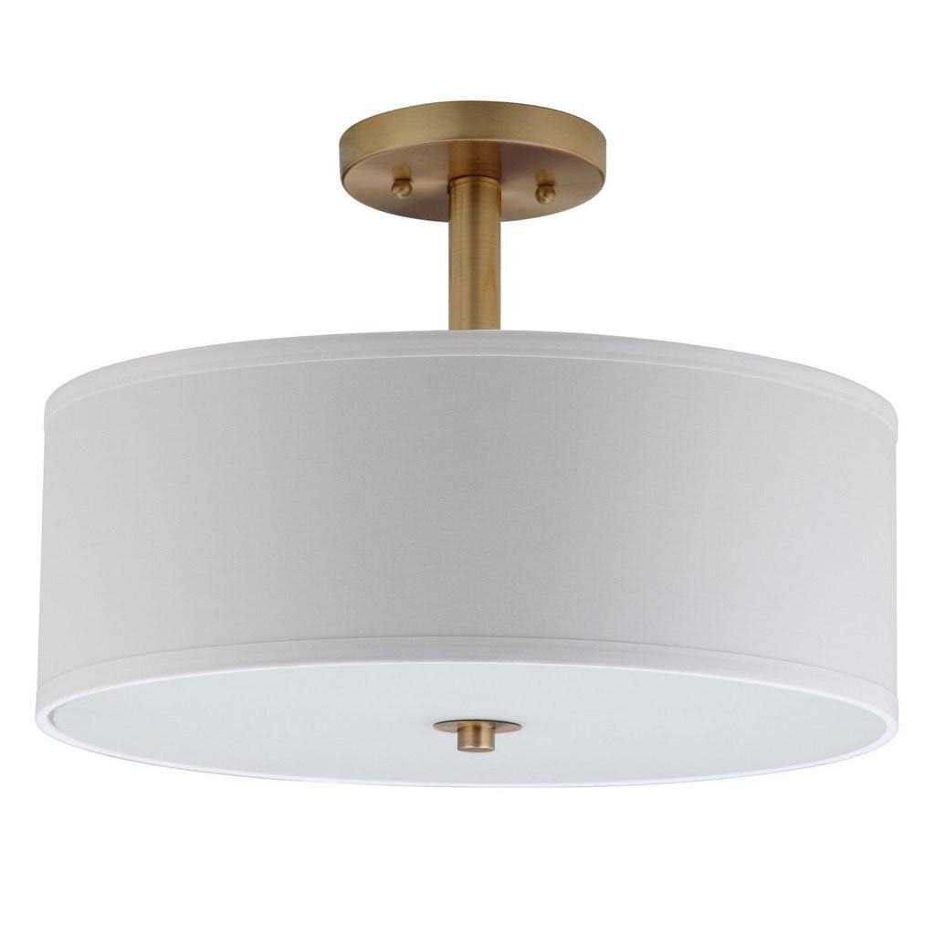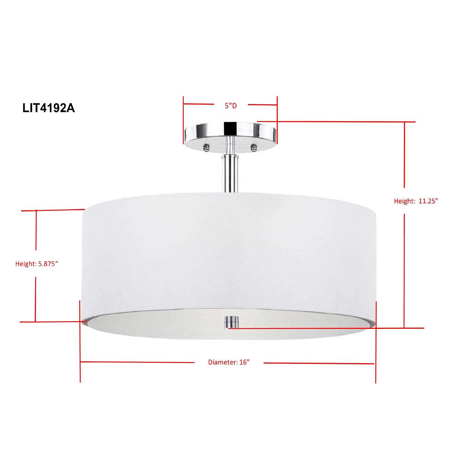 Dimensions: 16 diam. x 11.25H in.. Crafted with robust metal. Choose from available finishes. 6 in. cord. Requires three E26 LED A19 9W bulbs (included). The Safavieh Clara LIT4192B Semi Flush Mount Light creates a soothing, uncluttered look with a minimalistic design and muted color scheme. This mount light features a simple drum shade in a light and airy hue of white. The smooth, highly-durable metal frame and end-cap are finished in your choice of available finish. Color: Chrome/Gold – LIT4192B.