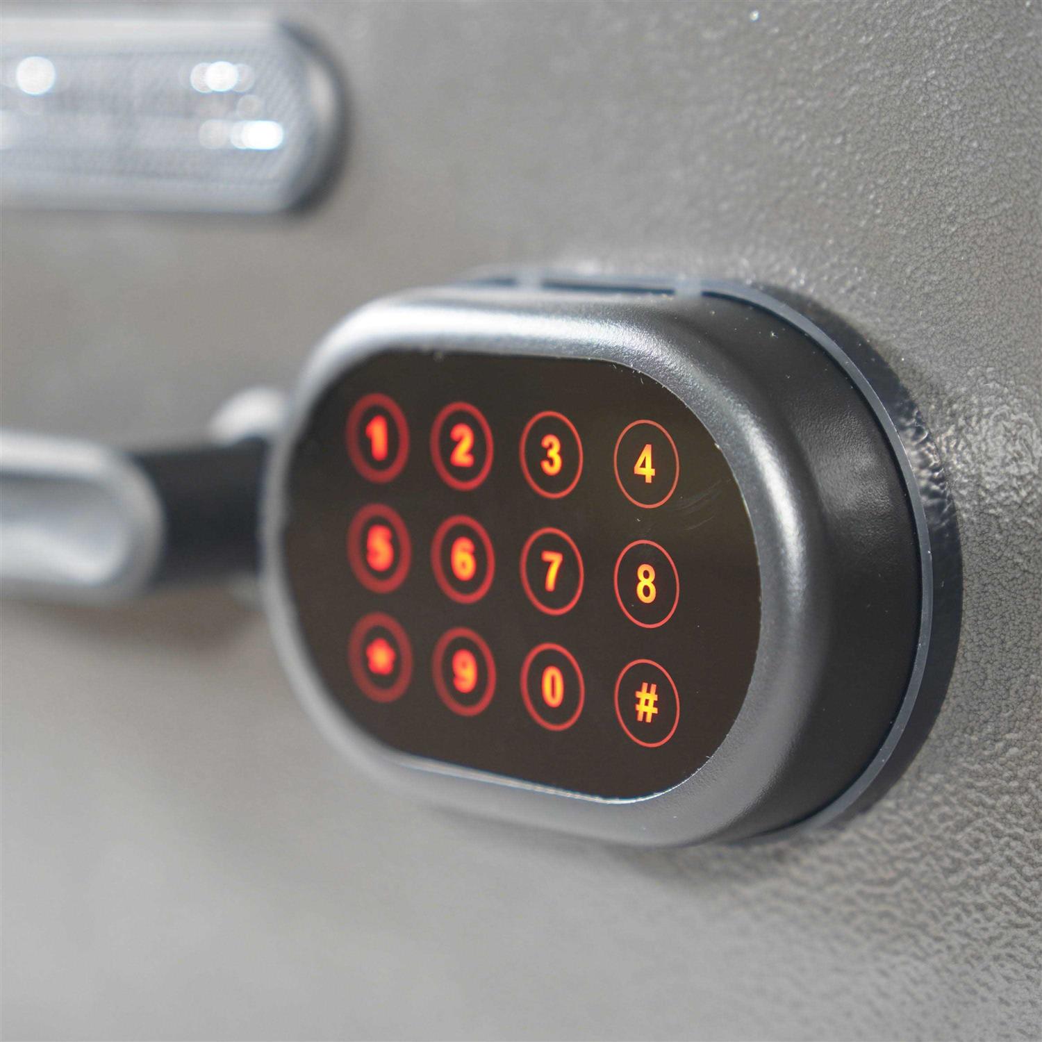Choose this anti-theft safe if you need to ensure paperwork and important items are protected. The fire-resistant safe can hold up against temperatures as high as 1,800°F for over an hour and offers 7 days of waterproof protection. Fire protection for 90-minutes in temperatures up to 1800°F. Waterproof for 7-days in up to 9 in. of standing water. Dial combination lock with preset code for simple entry and robust metal handle with matte black finish. Constructed out of industrial steel and has four 5mm steel locking plates – two active and two dead plates for robust security. Bright interior LED lighting for clear visibility in lowlight conditions. Fully carpeted interior, to protect the finish of valuables, with two height adjustable shelves, a pocket, and four key hooks mounted on the door. Approved by the California Department of Justice for firearm storage. Includes a waterproof bolt-down kit, Owner’s Manual, Quick-Start Guide, and two AA batteries. This product is heavy and/or oversized and may need more than one person to handle.