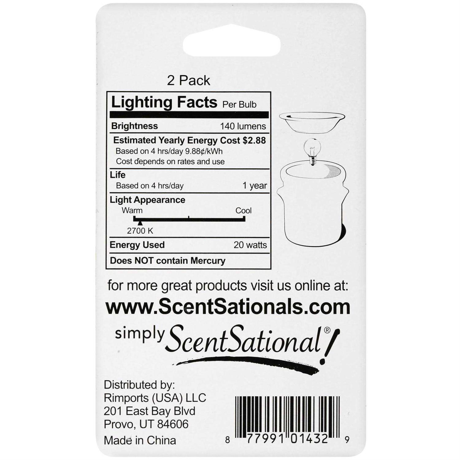 The ScentSationals 20 Watt Replacement Wax Warmer Clear Light Bulbs work perfectly with ScentSationals and Better Homes & Gardens decorative wax warmers. They provide a safe and clean heat source for melting aromatic wax cubes for optimal compatibility and scent dispersion throughout your home. These highly efficient bulbs can burn for 1500 hours each. They fit a G30-style base candelabra warmer. These bulbs aid in setting the scene for a comforting, soft, and cozy environment when paired with your favorite scented wax melts and decorative warmers by ScentSationals and Better Homes & Gardens. These are the recommended choice for your Better Homes & Gardens and/or ScentSationals wax warmers to provide a calming effect for your living room, kitchen, or bedroom lighting. Fragrances and warmers are sold separately.
