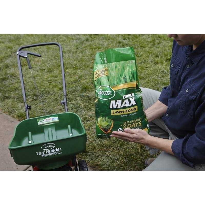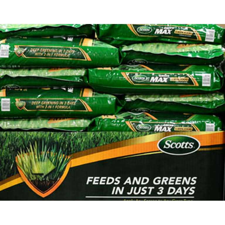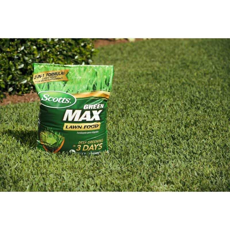 Get a deeper-green lawn in just 3 days! With its innovative 2-in-1 formula Scotts Green Max Lawn FoodFL fertilizes your grass and provides it with an additional iron supplement to give your yard a deeper green in 3 days. Apply using a Scotts broadcast rotary drop or Wizz spreader to up to 5 000 sq. ft. of lawn. Safe to use on any grass type Green Max Lawn FoodFL feeds for up to 3 months.