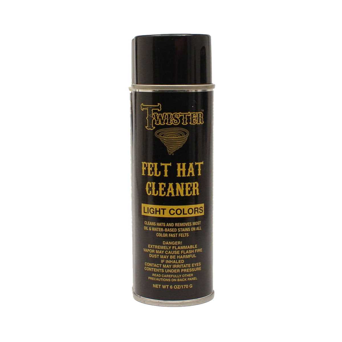 This wool felt hat cleaner can clean most oil or water based stains. Use with color-fast felts and fabrics. The Please refer to instructions on can for proper usage. The cleaner for light colors is 6 ounces, the cleaner for dark colors is 7 ounces. Works on most felts and fabrics. Clean wool hats. Removes most oil/water based stains. Refer to manufacturer directions. Made is USA.