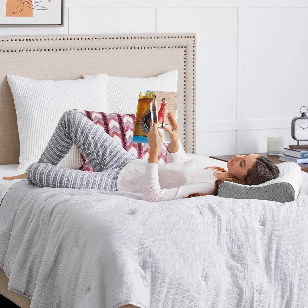 Sealy Sleep supported with the Memory Foam Contour Pillow, a carefully crafted pillow designed to help support a more natural alignment of your unique shape. Ergonomic shape focuses on cradling your head, neck, and shoulders with contoured dips to more comfortably support you. Included plush knit cover can be unzipped, removed and machine washed for easy care. The cover features antimicrobial fibres to help protect the pillow against common allergens, plus features moisture-wicking fabric to keep you cool and dry.