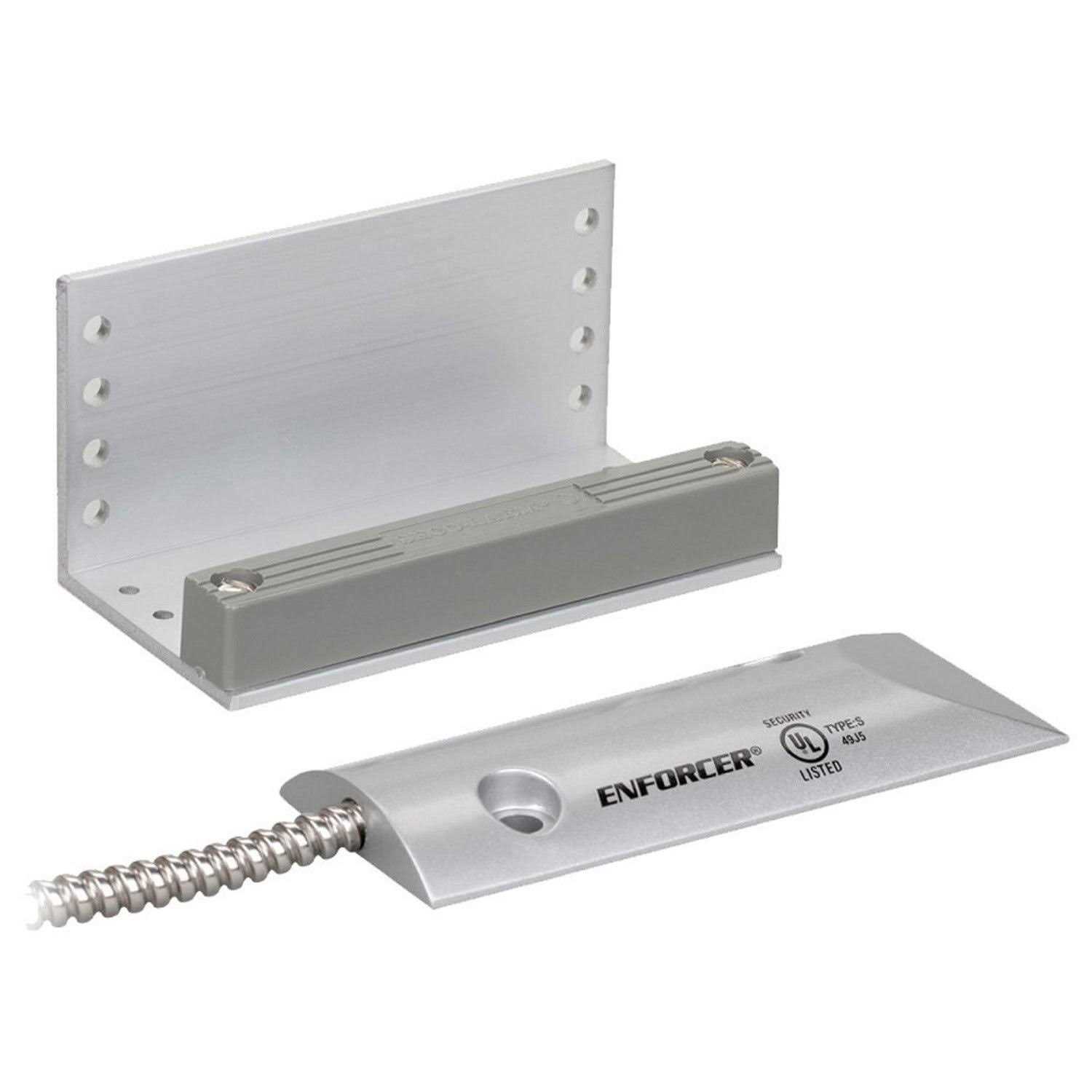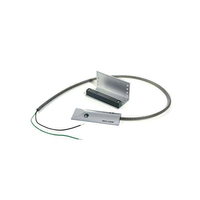 The Seco-Larm Enforcer Overhead Door-Mount Magnetic Contact, NO/NC is a contact switch designed for large doors and gates where regular contacts may be difficult to mount. The contact’s large gap allows use with even the largest doors, such as garage doors. The switch is contained in low-profile cast aluminum housing, and curved so that heavy vehicles can cross over without damaging it. Rugged, Long-Lasting Construction Seco-Larm contacts have a unique rhodium plating which has gone through a special oxygen treatment to deactivate the surface, thus eliminating the absorption of organic impurities, polymer growth during operation, and the possibility of contact freezing. The switch is housed in weatherproof die-cast aluminum constructed for surface-mounting on a garage floor. It can withstand heavy vehicle pressure without damage. The switch is safely enclosed in an epoxy compound, and a 24-inch flexible stainless-steel cable gives complete protection to the switch wiring. The magnet is housed in a high-impact weatherproof ABS plastic case and can be mounted on a garage door with an “L”-shaped bracket, which minimizes the effect of steel doors on magnets.